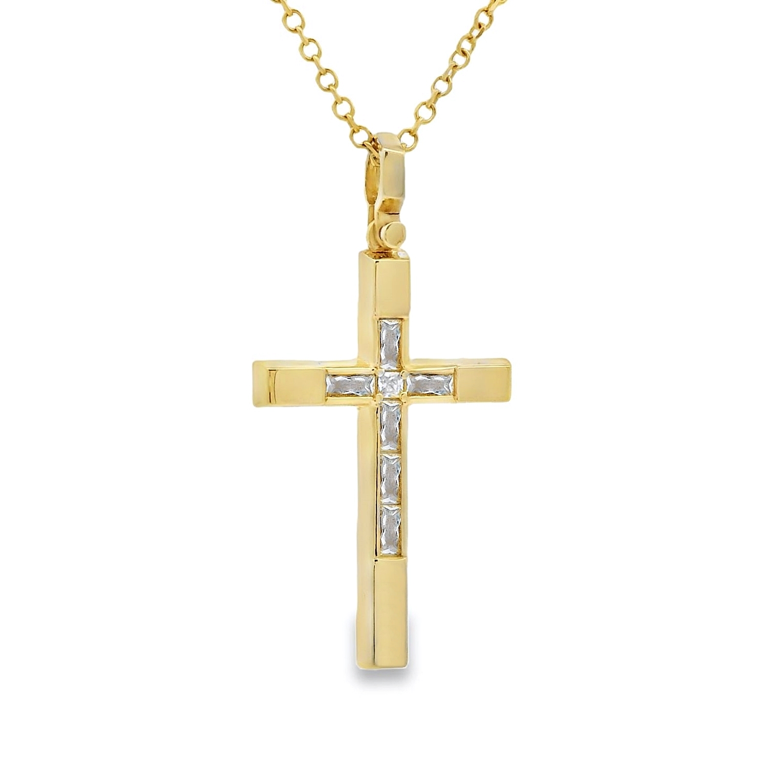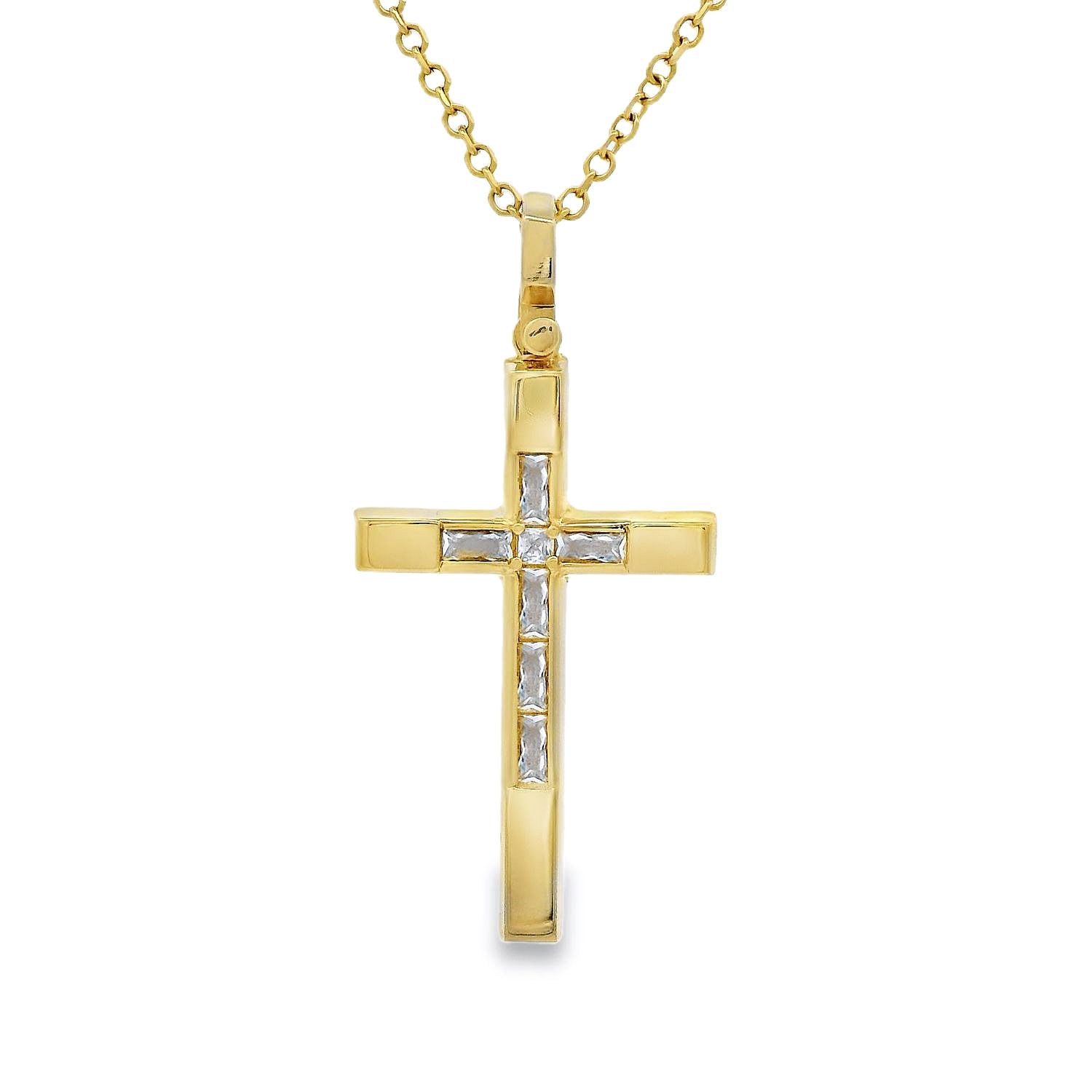 Women's cross in 14 karat yellow gold with cubic zirconia stones. The chain is sold separately.