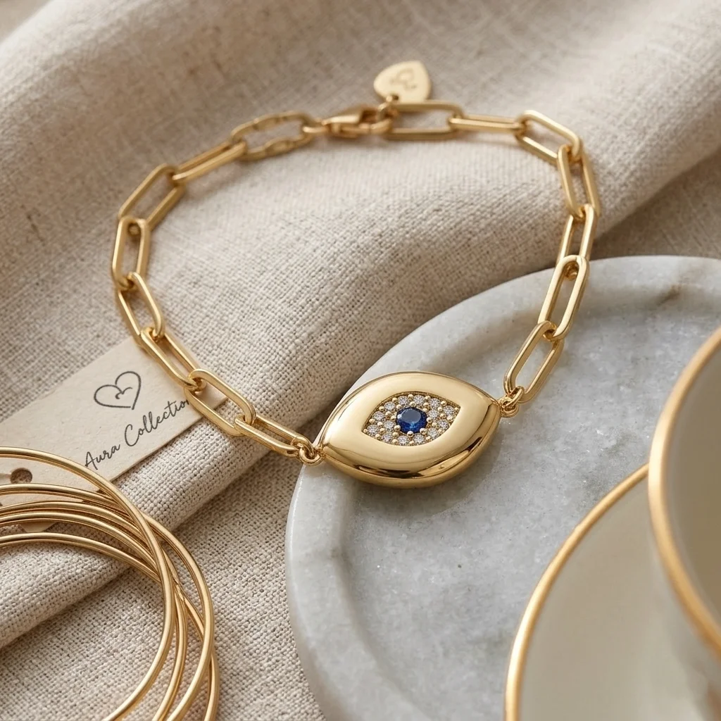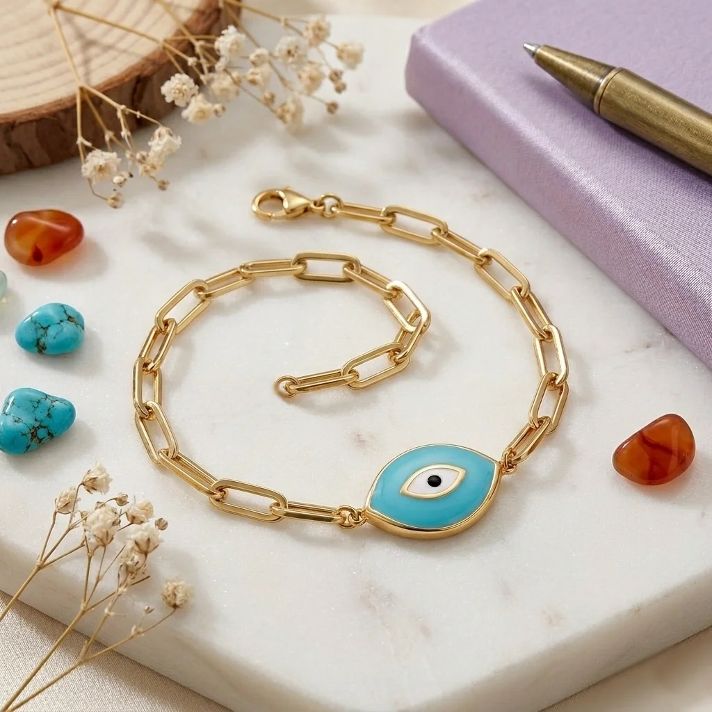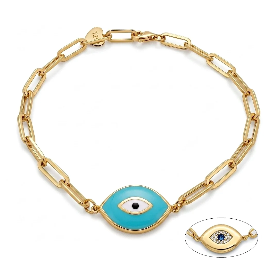 Ανακαλύψτε την ευελιξία με αυτό το minimal αισθητικής βραχιόλι 14 καρατίων. Σχεδιασμένο για τη σύγχρονη γυναίκα, διαθέτει ένα κεντρικό μοτίβο “μάτι” που αλλάζει όψη ανάλογα με τη διάθεσή σας, συνδυασμένο με την πιο hot τάση της σεζόν: την αλυσίδα τύπου paperclip. Η Modern Side: Μια πλευρά με ζωντανό τυρκουάζ σμάλτο για μια καλοκαιρινή, pop και trendy εμφάνιση. Η Glam Side: Μια πλευρά με πολυτελές “eye” design, διακοσμημένο με αστραφτερά λευκά ζιργκόν και ένα κεντρικό μπλε ζιργκόν, ιδανικό για πιο επίσημες περιστάσεις. Είναι το ιδανικό δώρο για εσάς ή τους αγαπημένους σας, καθώς συνδυάζει την προστασία του παραδοσιακού συμβόλου με την τελευταία λέξη της μόδας. Η δυνατότητα να το φοράτε από δύο πλευρές σημαίνει ότι έχετε δύο βραχιόλια στην τιμή του ενός, καλύπτοντας από το καθημερινό office look μέχρι την βραδινή σας έξοδο.