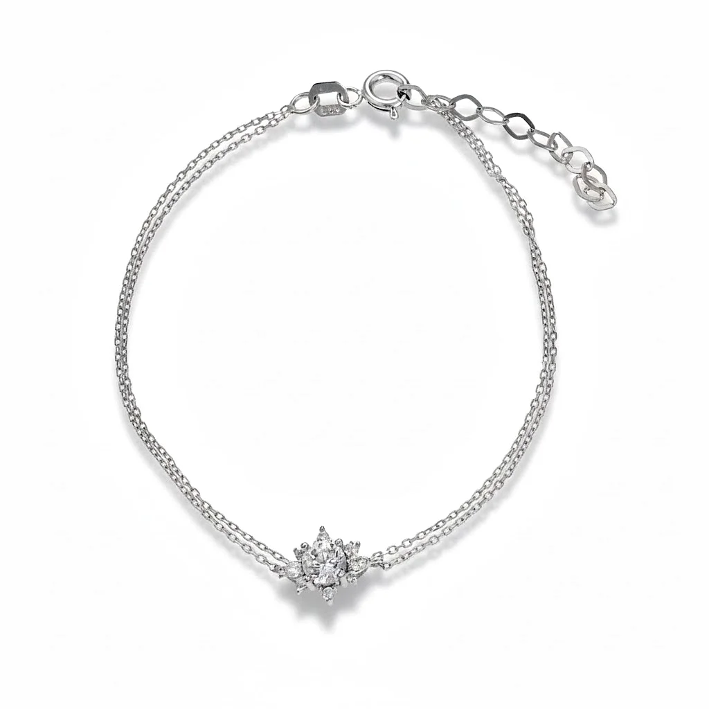 An αριστοκρατικό and φωτεινό βραχιόλι που αποπνέει την καθαρή πολυτέλεια του λευκόχρυσου. Κατασκευασμένο από λευκό χρυσό 14 καρατίων, αυτό το κόσμημα συνδυάζει την εκλεπτυσμένη αισθητική με μια μοντέρνα πινελιά χάρη στη διπλή του αλυσίδα. Αυτό το βραχιόλι είναι η ιδανική επιλογή για νύφες, επίσημες εμφανίσεις ή ως ένα πολύτιμο δώρο που συμβολίζει τη λάμψη και την κομψότητα.
