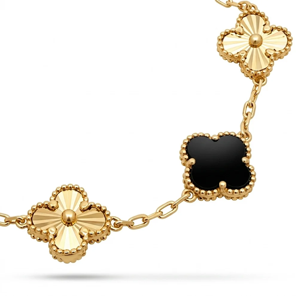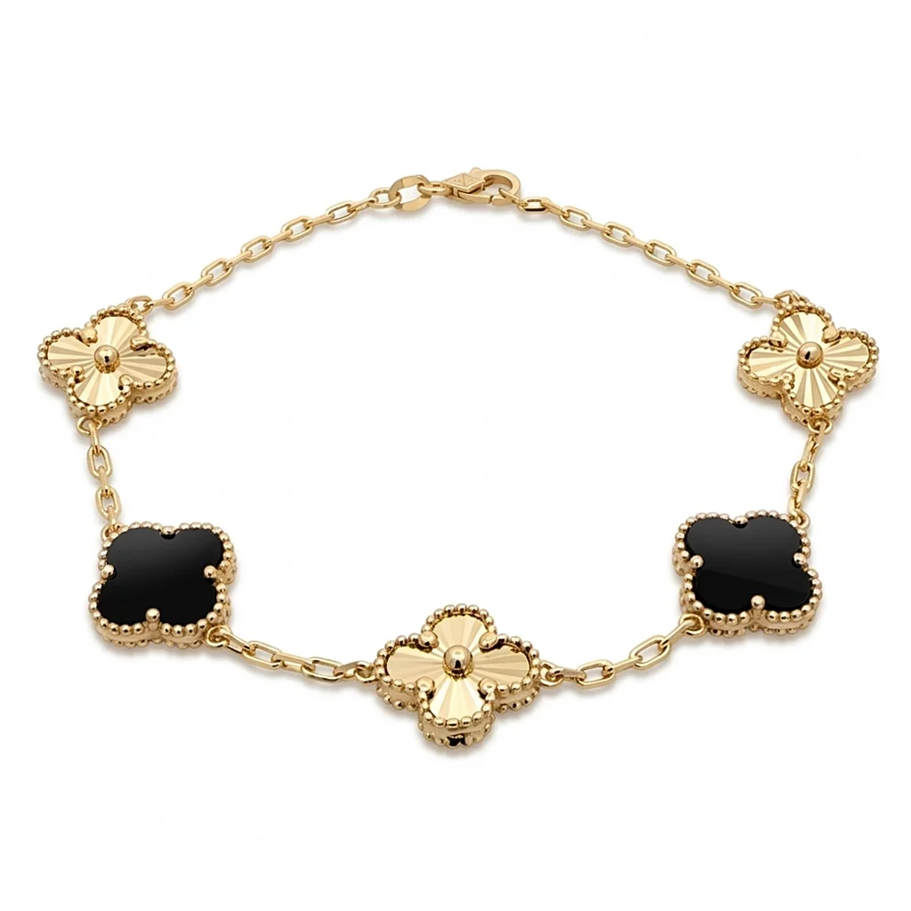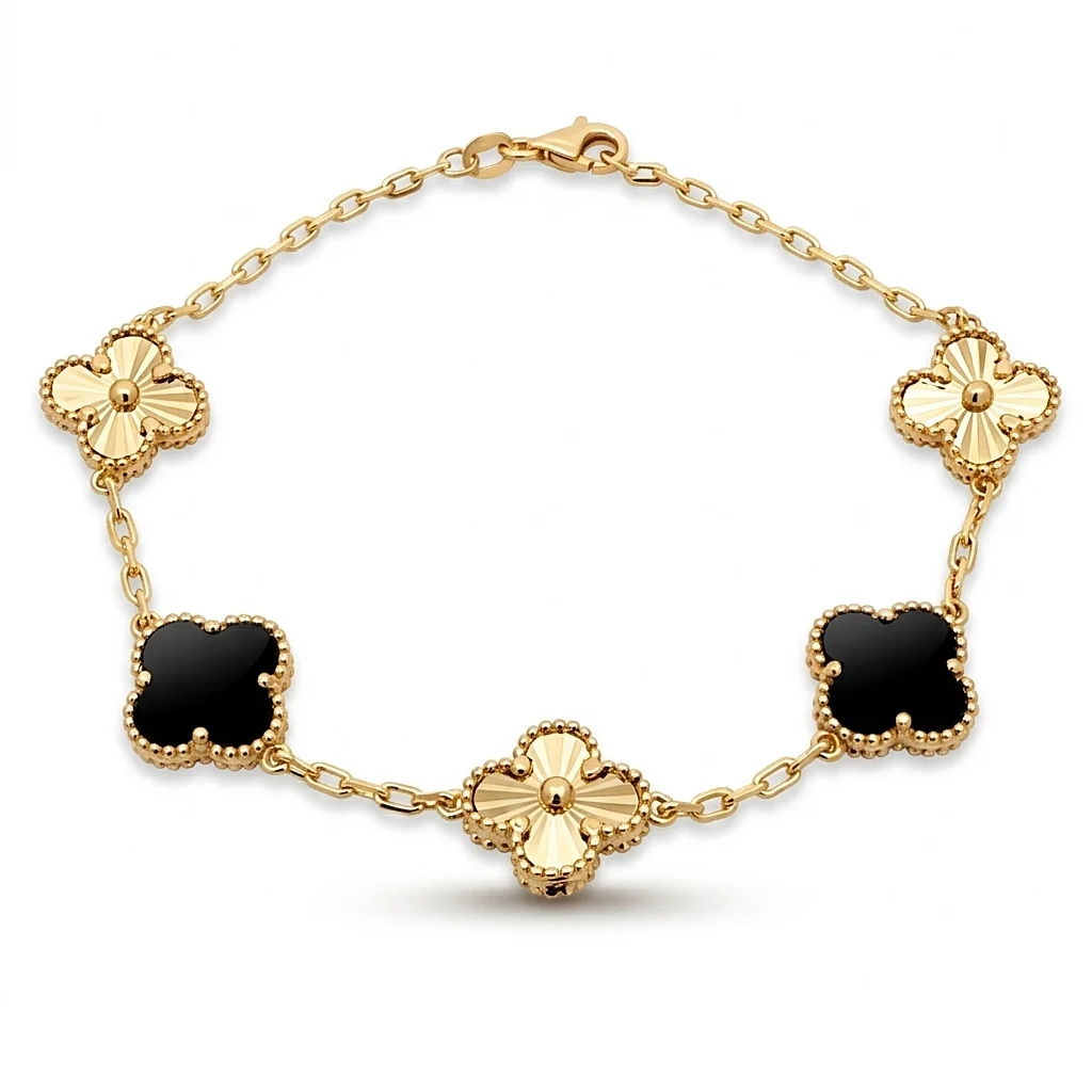 Βραχιόλι γυναικείο Clover με Μαύρο Όνυχα σε κίτρινο χρυσό 14 καράτια . Συνολικό μήκος 18cm.