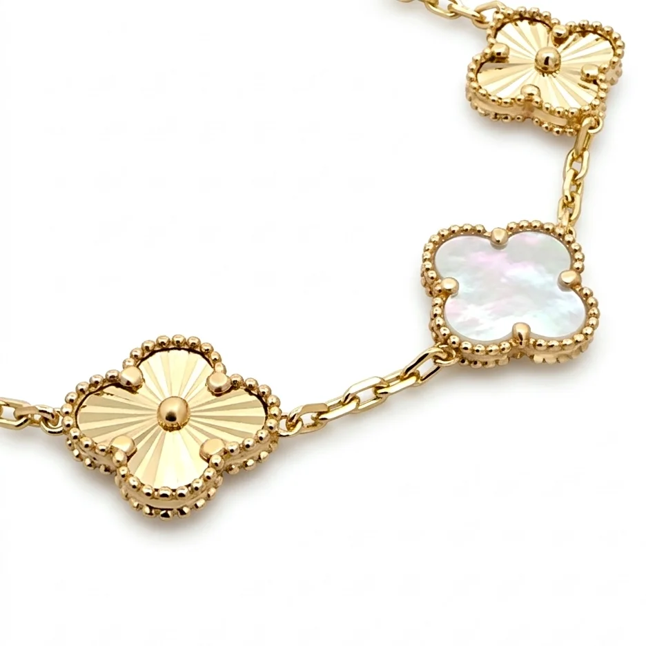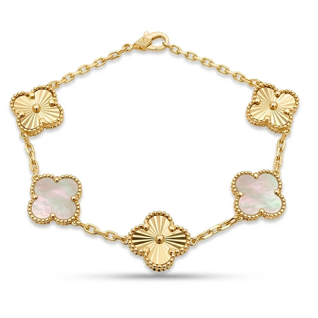 Ανακαλύψτε την απόλυτη έκφραση θηλυκότητας και κομψότητας με αυτό το εντυπωσιακό βραχιόλι 14 καρατίων. Ένα κόσμημα που συνδυάζει την κλασική γοητεία του κίτρινου χρυσού με την ιριδίζουσα λάμψη από το λευκό φίλντισι, δημιουργώντας ένα αριστούργημα που φοριέται από το πρωί έως το βράδυ. Το βραχιόλι διαθέτει πέντε μοτίβα σε σχήμα τετράφυλλου τριφυλλιού: τρία σε χρυσό με περίτεχνη ακτινωτή χάραξη που αντανακλά το φως με κάθε κίνηση, και δύο επενδυμένα με φίλντισι, προσφέροντας μια απαλή, πολυτελή αντίθεση. Το βραχιόλι έχει την απαραίτητη στιβαρότητα που εγγυάται αντοχή στον χρόνο και εξαιρετική αίσθηση στην αφή. Το τριφύλλι συμβολίζει την τύχη και την αγάπη, καθιστώντας το το ιδανικό δώρο για εσάς ή τα αγαπημένα σας πρόσωπα.