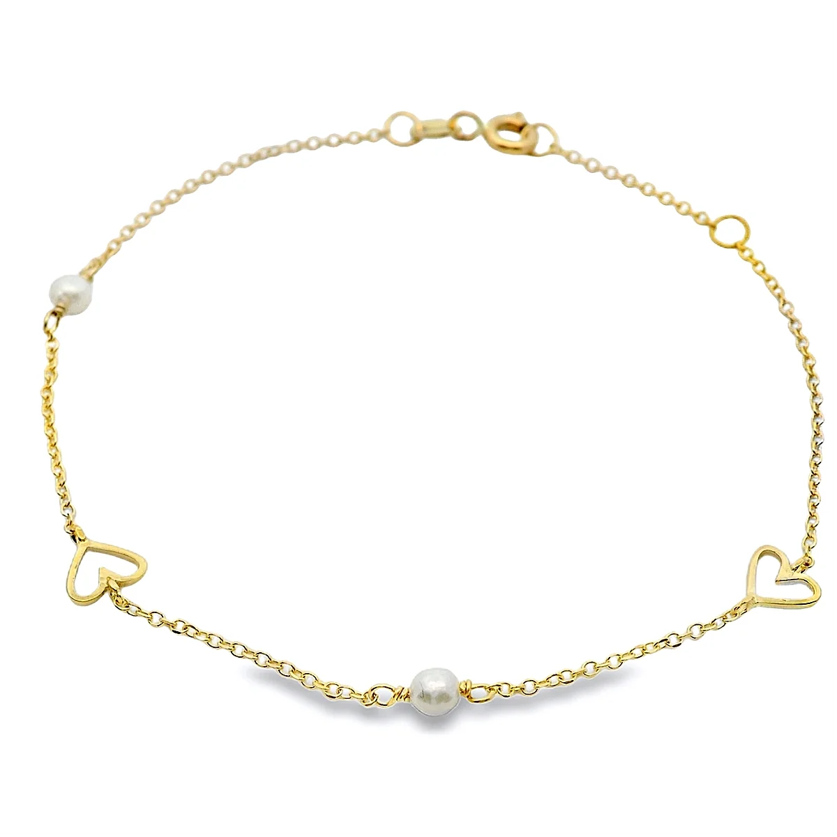 Βραχιόλι καρδιές και μαργαριτάρια σε χρυσό 14 καρατίων. Μήκος αλυσίδας 18cm.