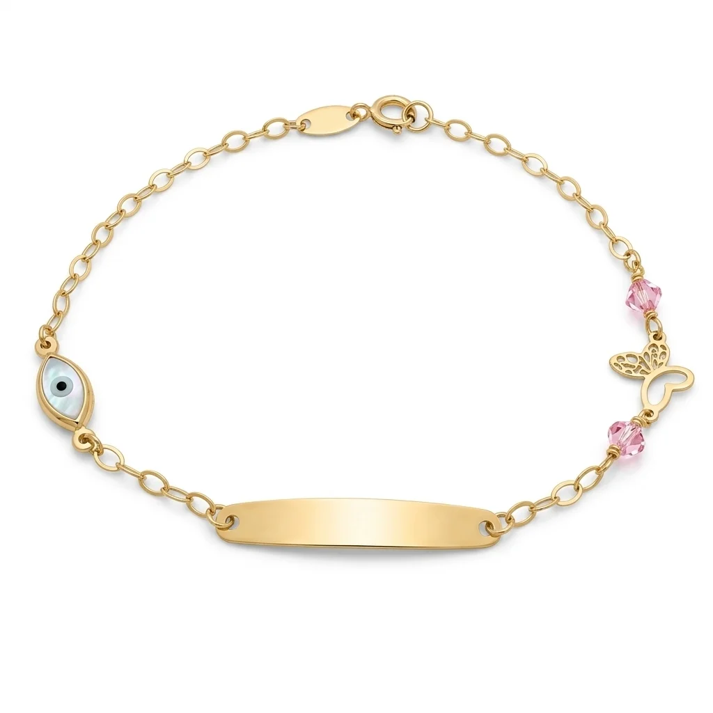 Βραχιόλι Ταυτότητα με Ματάκι και Πεταλούδα με Ροζ Πέτρες σε κίτρινο χρυσό 9 καρατίων. Μήκος αλυσίδας 18cm.