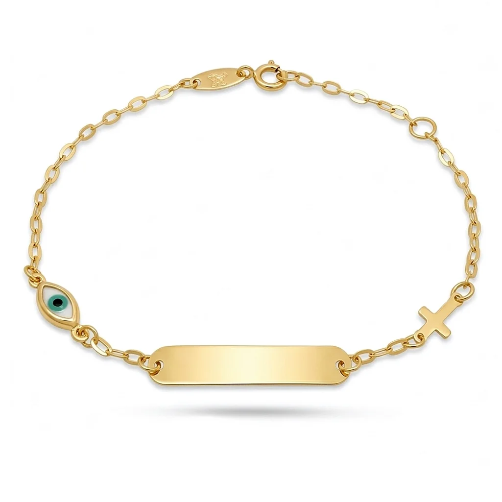 Βραχιόλι Ταυτότητα με Ματάκι και Σταυρό σε κίτρινο χρυσό 9 καρατίων. Μήκος αλυσίδας 14cm.