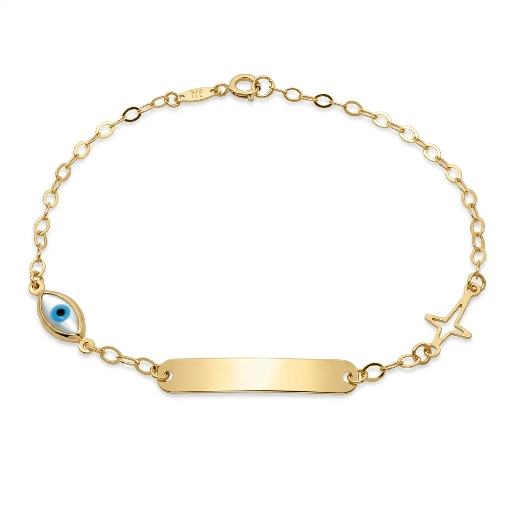 Βραχιόλι Ταυτότητα με Ματάκι και Σταυρό σε κίτρινο χρυσό 9 καρατίων. Μήκος αλυσίδας 18cm.