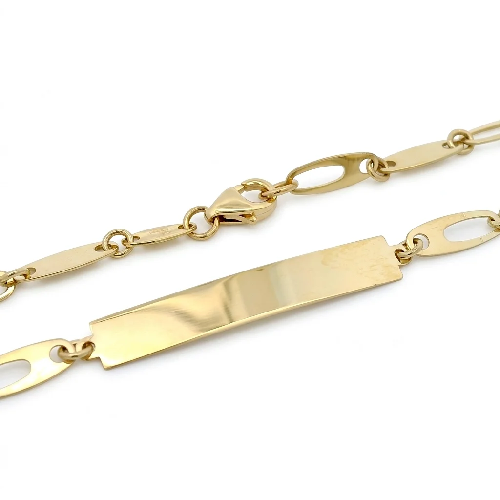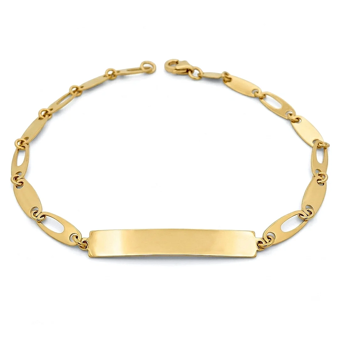 Ένα διαχρονικό και στιβαρό κόσμημα που συνδυάζει την κλασική γοητεία της ταυτότητας με έναν μοντέρνο, διαφοροποιημένο σχεδιασμό αλυσίδας. Αυτό το βραχιόλι είναι κατασκευασμένο από χρυσό 9 καρατίων, προσφέροντας υψηλή αντοχή και την πολυτελή λάμψη του κίτρινου χρυσού σε προσιτή τιμή. Το κεντρικό στοιχείο είναι μια λεία, γυαλιστερή πλακέτα, ιδανική για χάραξη ονόματος, ημερομηνίας ή ενός προσωπικού μηνύματος. Η αλυσίδα του ξεχωρίζει για τον ιδιαίτερο σχεδιασμό της, συνδυάζοντας κρίκους τύπου Figaro με επιμήκη οβάλ στοιχεία, χαρίζοντας μια μοναδική αίσθηση στιβαρότητας και στυλ στον καρπό.