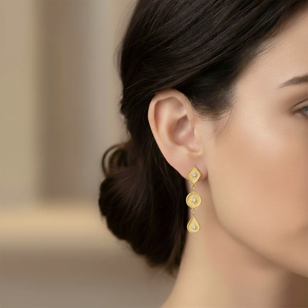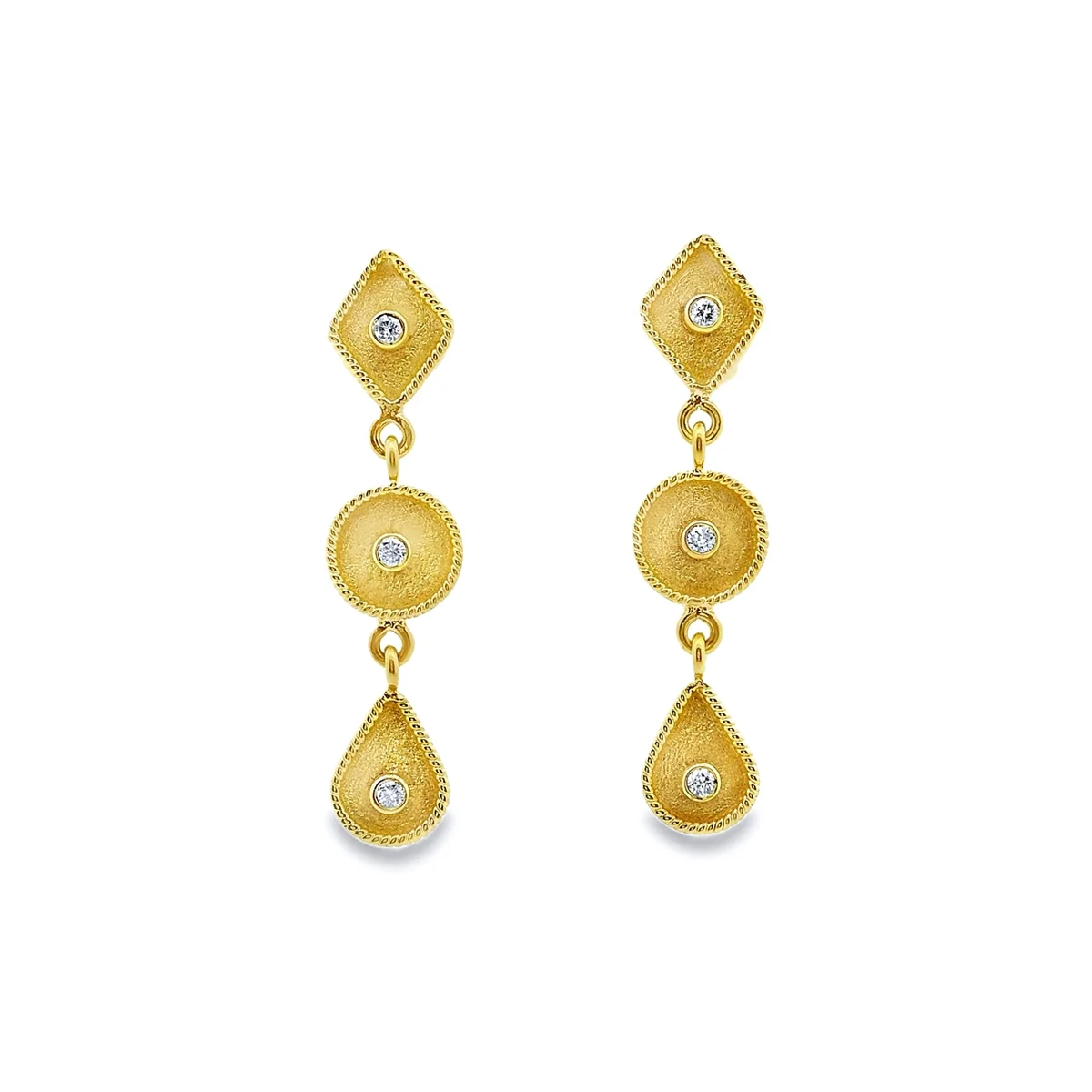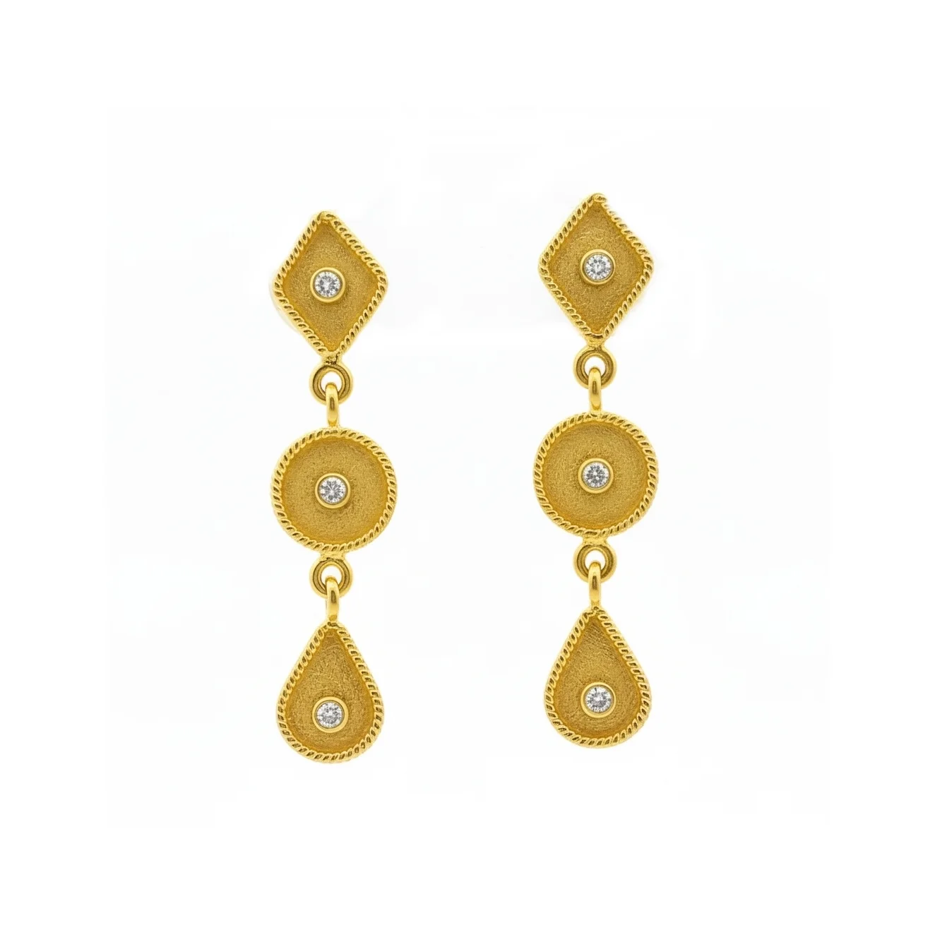 Byzantine Handmade Earrings in 18 karat gold with white diamonds with excellent brilliant cut brilliant cut diamonds total weight 0,12ct in G color and VS clarity. Butterfly clasp.