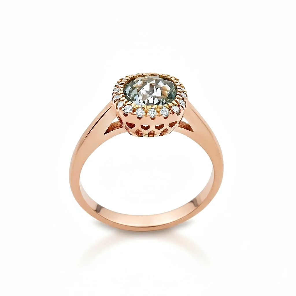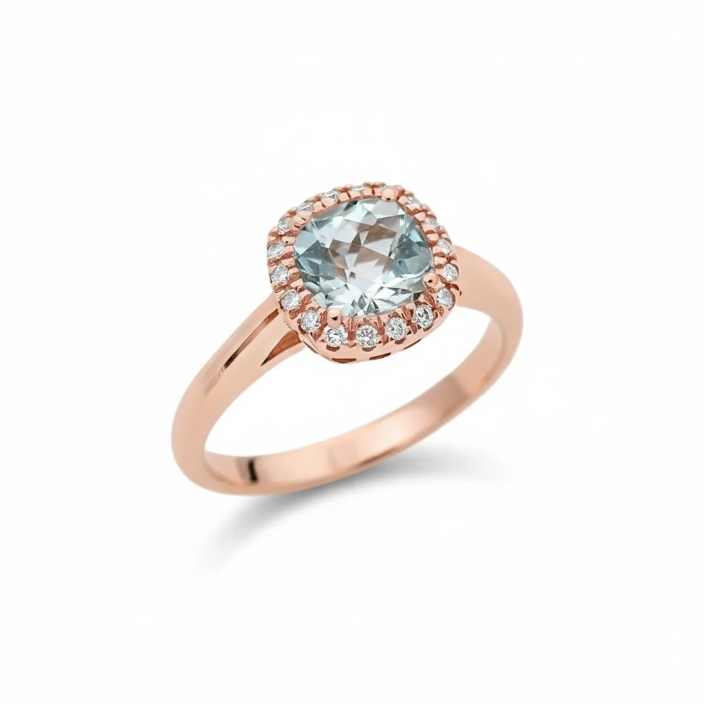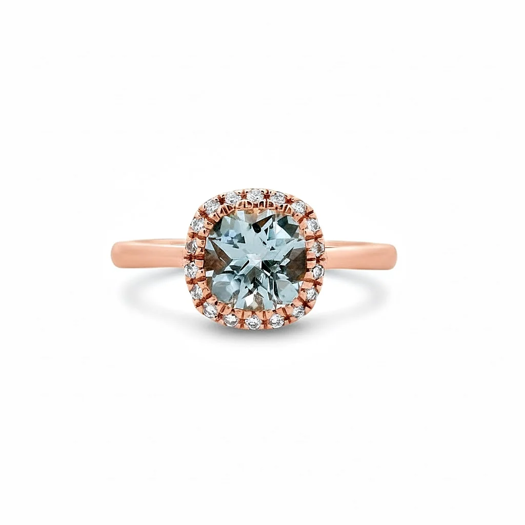 Ring in 18 carat pink gold with cushion cut aquamarine weighing 0.93ct and white brilliant cut diamonds total weight 0.09ct, G colour and VS clarity.