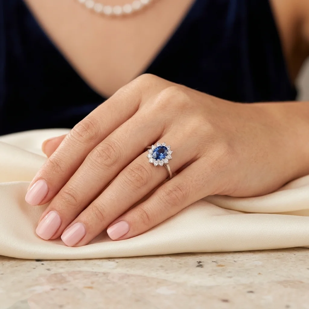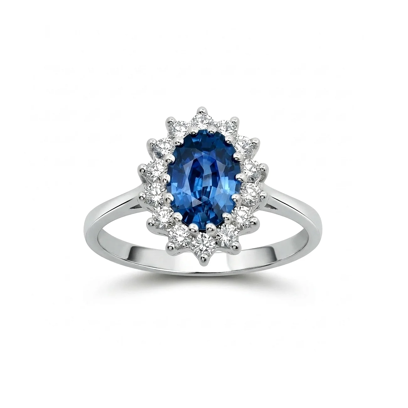 Χαρίστε στον εαυτό σας ή στα αγαπημένα σας πρόσωπα ένα διαχρονικό κόσμημα υψηλής αισθητικής. Αυτή η εξαιρετική ροζέτα συνδυάζει το βαθύ, μυστηριώδες μπλε του φυσικού ζαφειριού με την αξεπέραστη λάμψη των διαμαντιών, τοποθετημένα σε μια βάση από λευκό χρυσό 18 καρατίων. Κλασική ροζέτα με το ζαφείρι σε οβάλ κοπή, πλαισιωμένο από λαμπερά διαμάντια που ενισχύουν το μέγεθος και τη φωτεινότητά του. Το ζαφείρι είναι ο λίθος της σοφίας και της ευγένειας. Με το κλασικό και κομψό του στυλ, το δαχτυλίδι αυτό αποτελεί την ιδανική πρόταση για ένα δαχτυλίδι αρραβώνων με αριστοκρατικό αέρα ή για ένα δώρο που θα μείνει αναλλοίωτο στο πέρασμα του χρόνου.