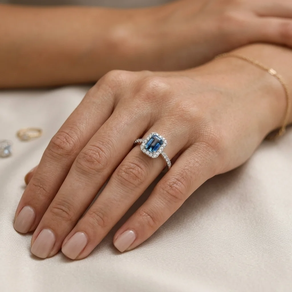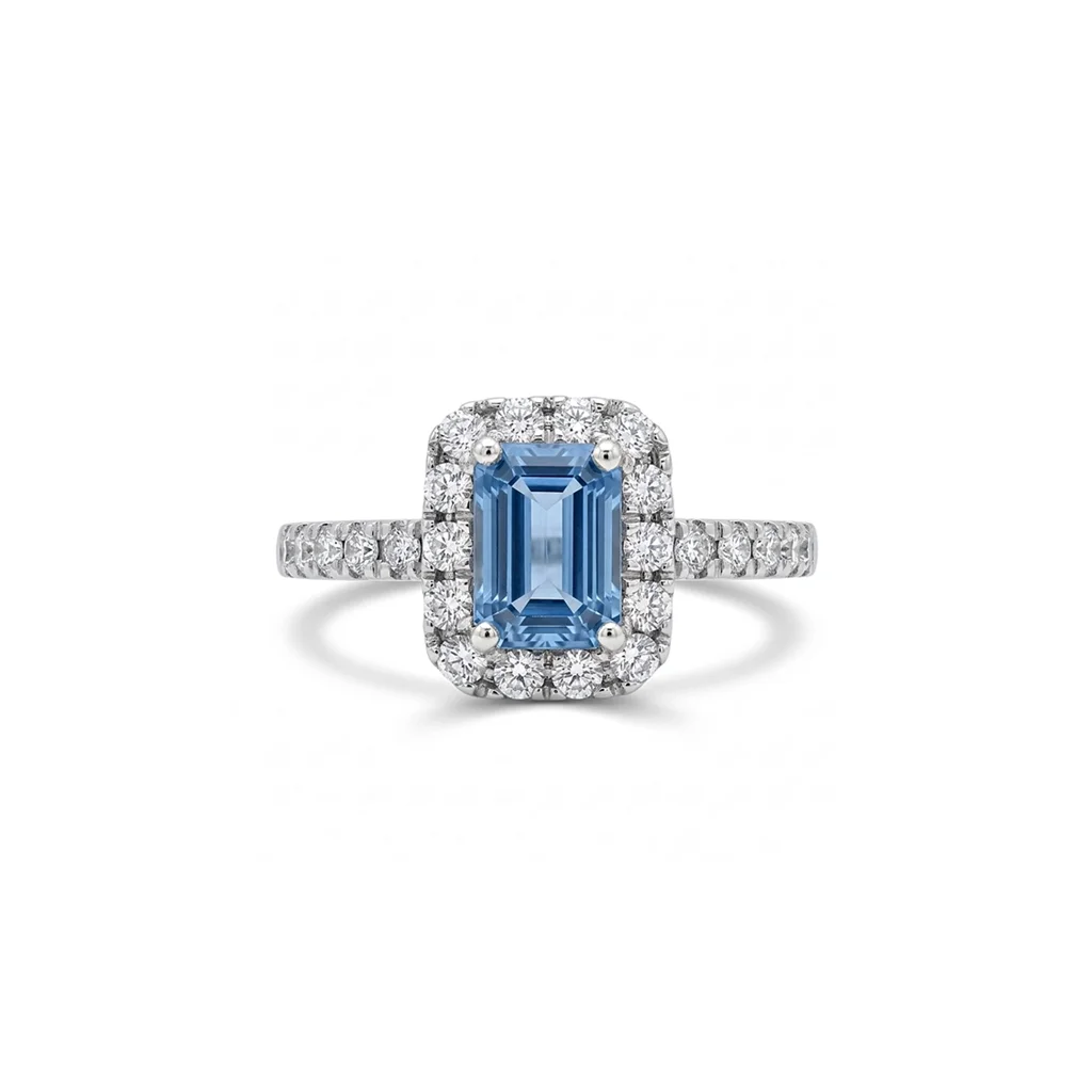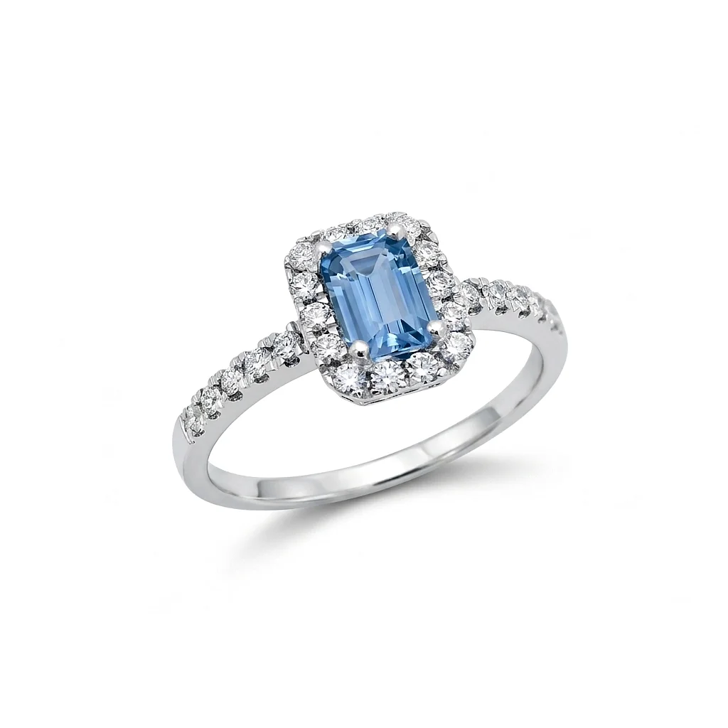 Δακτυλίδι σε λευκό χρυσό 18 καρατίων με Ζαφείρι 0.62ct σε κοπή emerald και λευκά διαμάντια περιμετρικά 0.24ct χρώματος G και καθαρότητας VS.