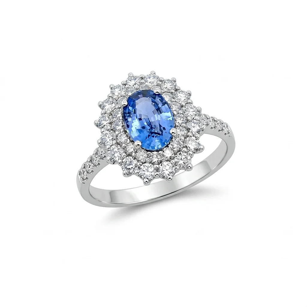Δακτυλίδι σε λευκό χρυσό 18 καρατίων με Ζαφείρι 0.85ct σε κοπή οβάλ και λευκά διαμάντια περιμετρικά 0.51ct χρώματος G και καθαρότητας VS.