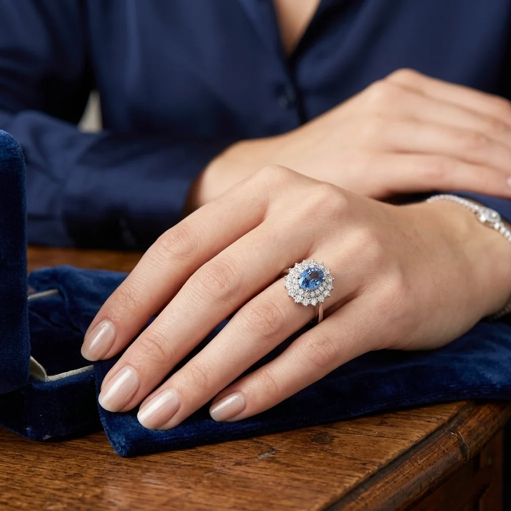 Ένα κόσμημα-σύμβολο κομψότητας που αιχμαλωτίζει το φως με κάθε κίνηση. Αυτό το εξαιρετικό δαχτυλίδι από λευκό χρυσό 18 καρατίων διαθέτει ένα βαθύ μπλε ζαφείρι υψηλής ποιότητας, το οποίο περιβάλλεται από ένα πλούσιο στεφάνι και μια επενδυμένη γάμπα με διαμάντια Brilliant. Κλασική οβάλ ροζέτα που προσφέρει ενισχυμένη λάμψη και μια αίσθηση πολυτέλειας που επεκτείνεται περιμετρικά του δακτύλου. Με περισσότερο από μισό καράτι διαμαντιών, το συγκεκριμένο δαχτυλίδι προσφέρει μια εξαιρετική αναλογία λάμψης και χρώματος. Το λευκό μέταλλο αναδεικνύει την καθαρότητα των διαμαντιών και το “βασιλικό” μπλε του ζαφειριού. Αποτελεί την τέλεια πρόταση για ένα εντυπωσιακό δαχτυλίδι αρραβώνων ή για ένα δώρο επετείου που θα μείνει αξέχαστο.