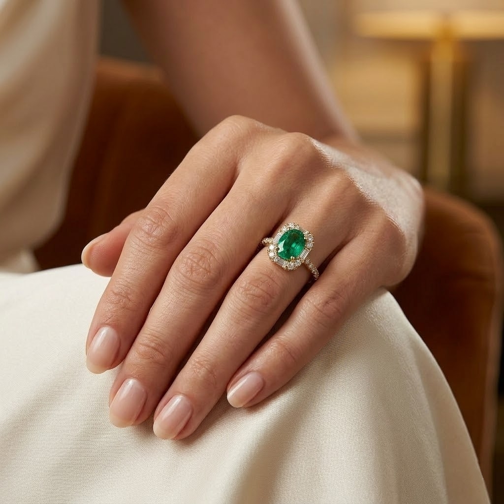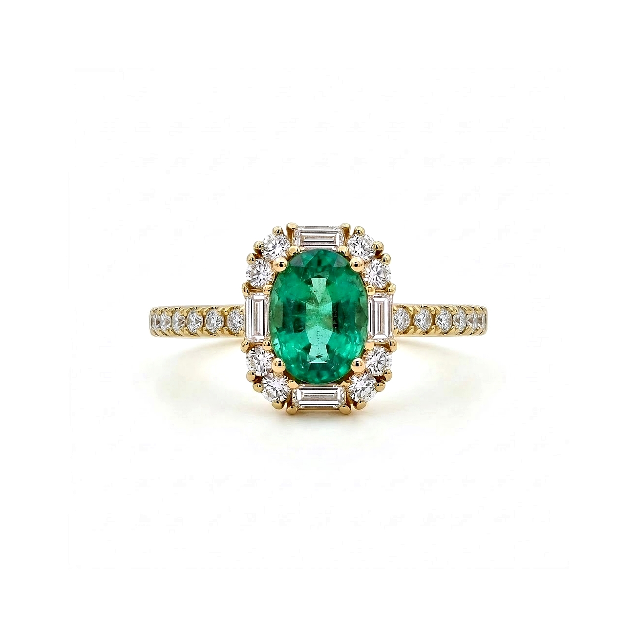 Αυτό το αριστοκρατικό δαχτυλίδι από χρυσό 18Κ αποτελεί μια ωδή στην κλασική πολυτέλεια, συνδυάζοντας το καθηλωτικό πράσινο ενός φυσικού σμαραγδιού με τη λάμψη διαμαντιών δύο διαφορετικών κοπών. Στο επίκεντρο, το οβάλ σμαράγδι πλαισιώνεται από μια μοναδική ροζέτα που εναλλάσσει διαμάντια κοπής Brilliant και Baguette, δημιουργώντας ένα περίτεχνο γεωμετρικό μοτίβο. Το μισόβερο δέσιμο στη γάμπα του δαχτυλιδιού ολοκληρώνει τον λαμπερό σχεδιασμό, προσφέροντας ένα αποτέλεσμα που είναι ταυτόχρονα επιβλητικό και φινετσάτο. Ιδανικό για γυναίκες που αναζητούν ένα ξεχωριστό κομμάτι με προσωπικότητα. Tο δαχτυλίδι συνοδεύεται από πιστοποιητικό γνησιότητας και πολυτελή συσκευασία, καθιστώντας το μια εξαιρετική επιλογή για μια αξέχαστη πρόταση γάμου ή μια σημαντική επέτειο.