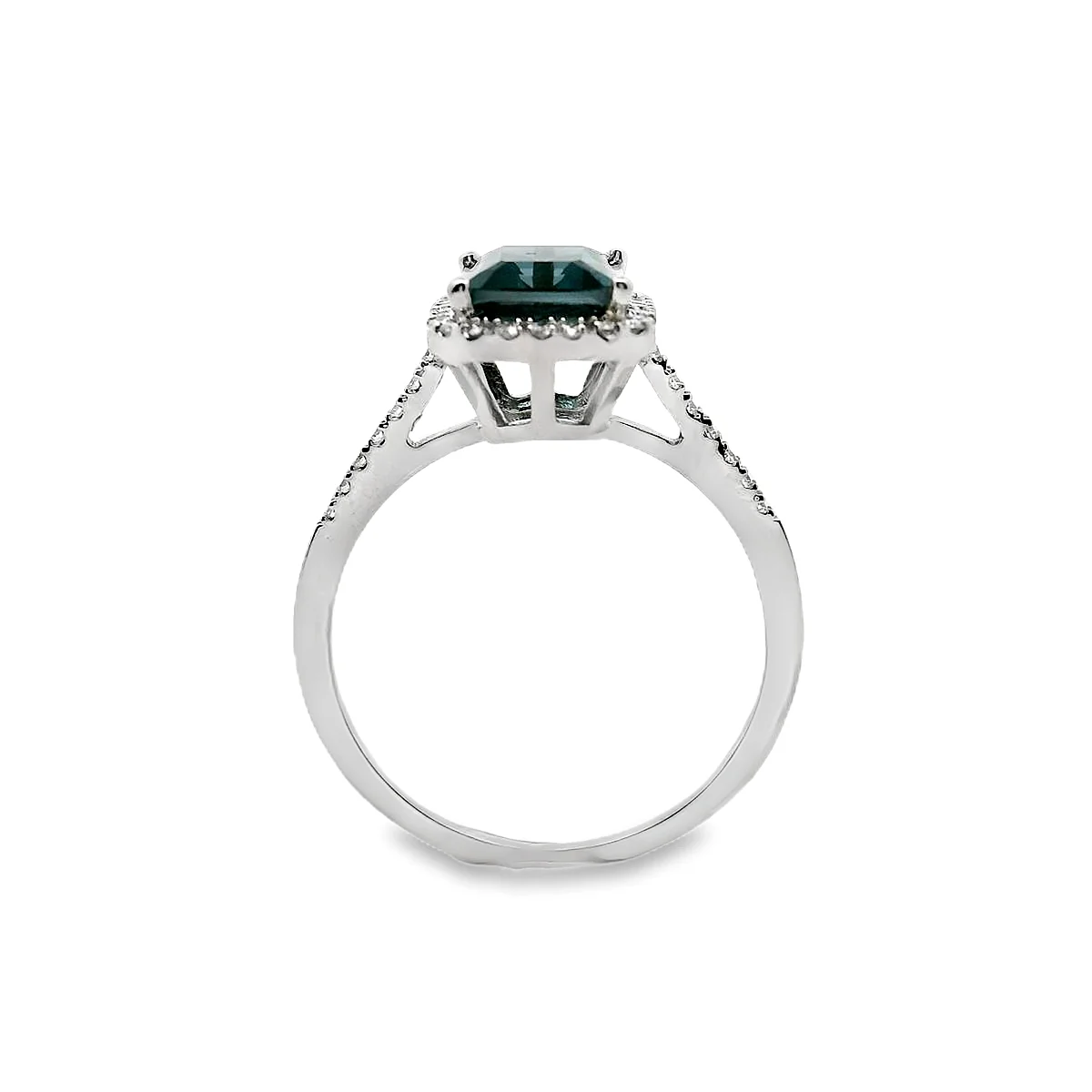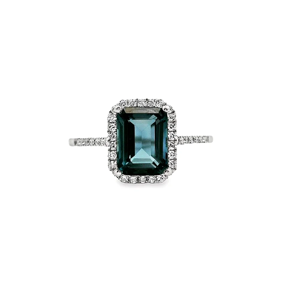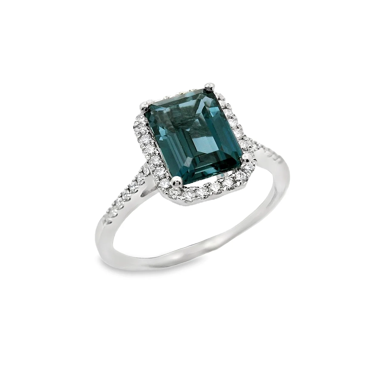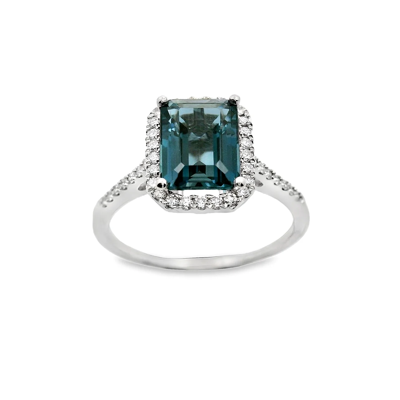 18 carat white gold rosette ring with London Blue Topaz in emerald cut weighing 1.88ct and white diamonds around the ring totaling 0.19ct in G colour and VS clarity.