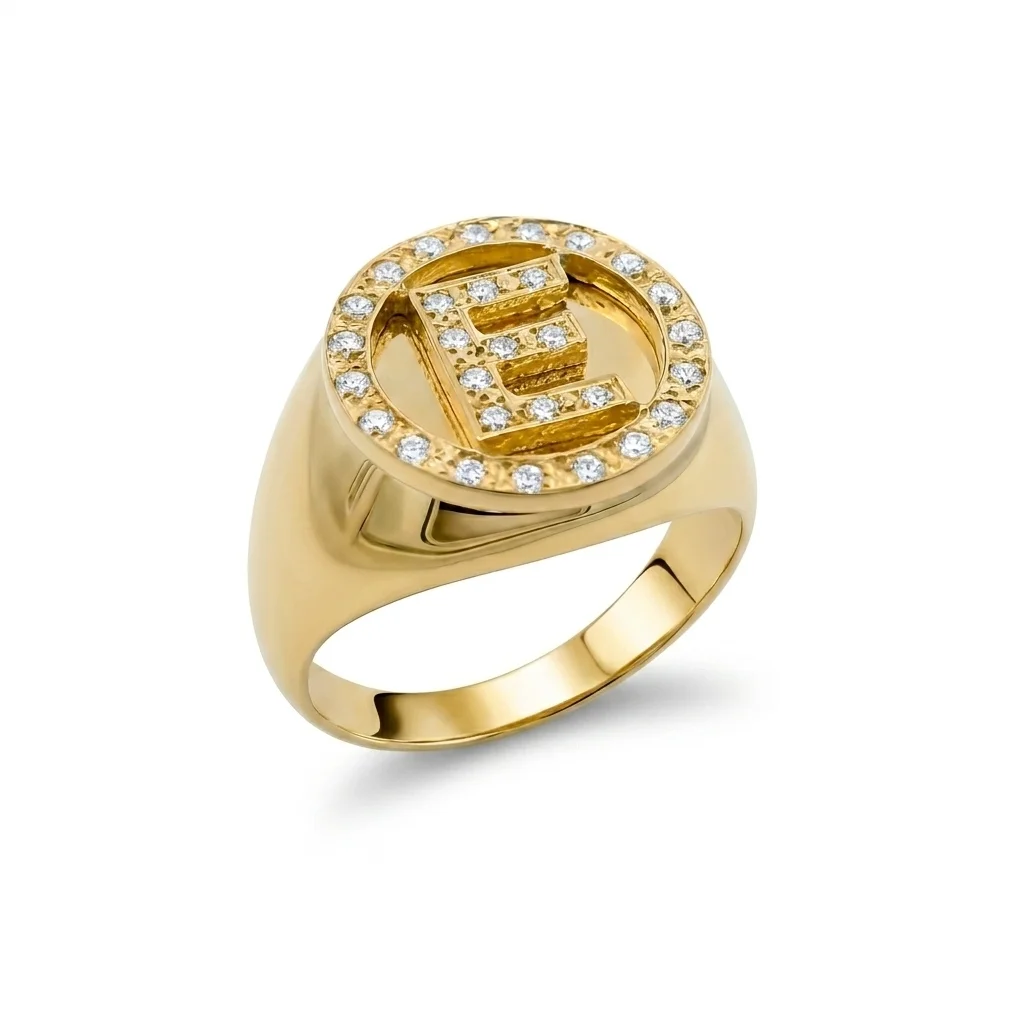 Η Προσωπική σας Υπογραφή σε Χρυσό! Εκφράστε την ταυτότητά σας με ένα επιβλητικό δαχτυλίδι 14 καρατίων που συνδυάζει την παράδοση με το glam στυλ. Αυτό το δαχτυλίδι τύπου σεβαλίέ διαθέτει ένα περίτεχνο μονόγραμμα “Ε” στο κέντρο του, πλαισιωμένο από αστραφτερές πέτρες ζιργκόν, δημιουργώντας ένα κόσμημα που αποπνέει κύρος και κομψότητα. Το δαχτυλίδι σεβαλιέ με μονόγραμμα είναι η απόλυτη τάση και το ιδανικό δώρο για εσάς ή για ένα αγαπημένο πρόσωπο. Είναι ένα κομμάτι που φοριέται άνετα στον παράμεσο ή στο μικρό δάχτυλο για μια πιο fashion-forward εμφάνιση. Ιδανικό για δώρο ενηλικίωσης, αποφοίτησης ή γενεθλίων, καθώς αποτελεί ένα κόσμημα με συναισθηματική αξία που θα κρατήσει μια ζωή.