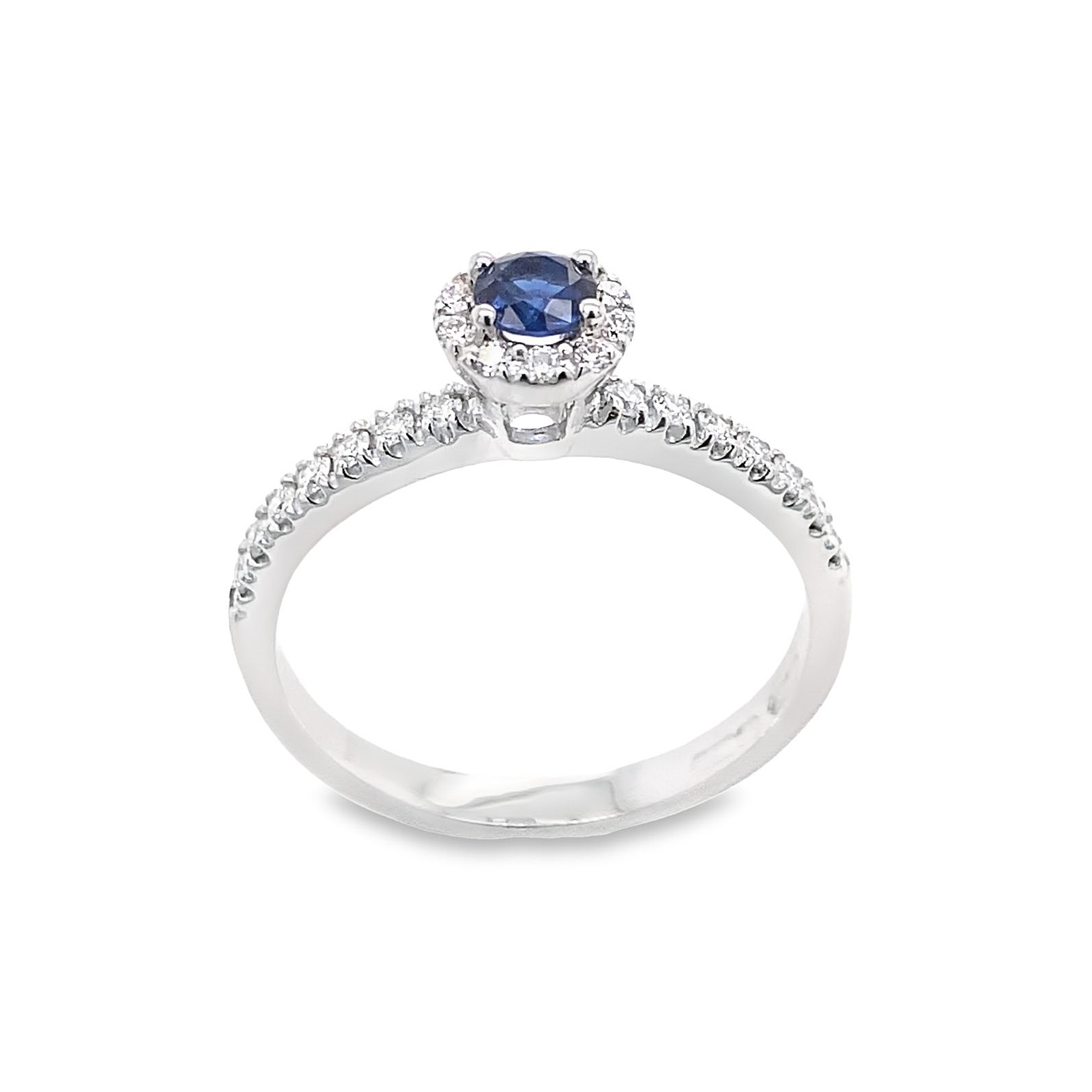 Δακτυλίδι σε λευκό χρυσό 18 καρατίων με μπλε ζαφείρι βάρους 0,20ct στο κέντρο και λευκά διαμάντια σε κοπή μπριγιάν περιμετρικά συνολικού βάρους 0,21ct χρώματος G και καθαρότητας VS.