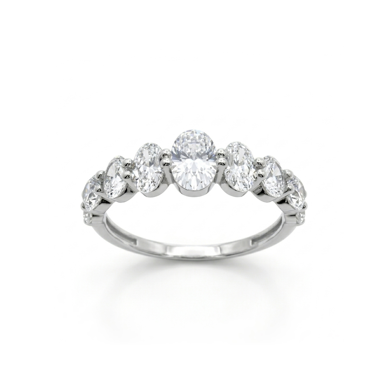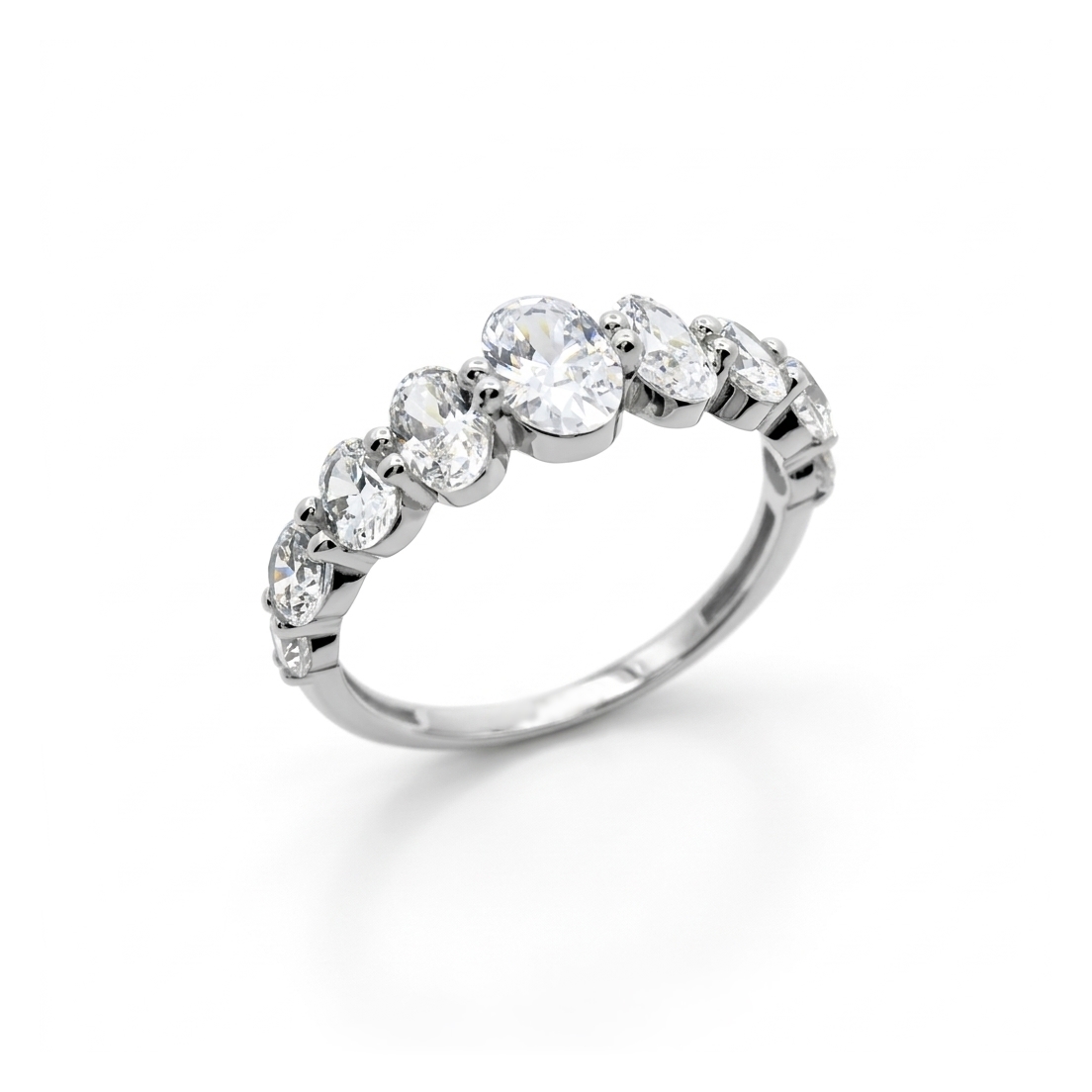 Ένα εντυπωσιακό και μοντέρνο σειρέ δαχτυλίδι, που ξεχωρίζει για τον ιδιαίτερο σχεδιασμό των πετρών του. Αποτελεί μια εξαιρετική επιλογή για μια γυναίκα που αναζητά ένα κόσμημα με όγκο και λάμψη. Κατασκευασμένο από λευκό χρυσό 9 καρατίων, με λουστρέ φινίρισμα που αναδεικνύει την ψυχρή, καθαρή απόχρωση του μετάλλου. Στολίζεται από επτά λαμπερά ζιργκόν σε οβάλ στρόγγυλη κοπή, τα οποία είναι τοποθετημένα σε φθίνουσα σειρά μεγέθους από το κέντρο προς τα πλάγια. Η κεντρική οβάλ πέτρα είναι η μεγαλύτερη, δίνοντας στο δαχτυλίδι μια αίσθηση μονόπετρου, ενώ οι υπόλοιπες πέτρες πλαισιώνουν αρμονικά τη γάμπα. Οι πέτρες συγκρατούνται με διακριτικά δόντια, εξασφαλίζοντας σταθερότητα και επιτρέποντας στο φως να διαπερνά τα ζιργκόν για μέγιστη σπινθηροβολία.