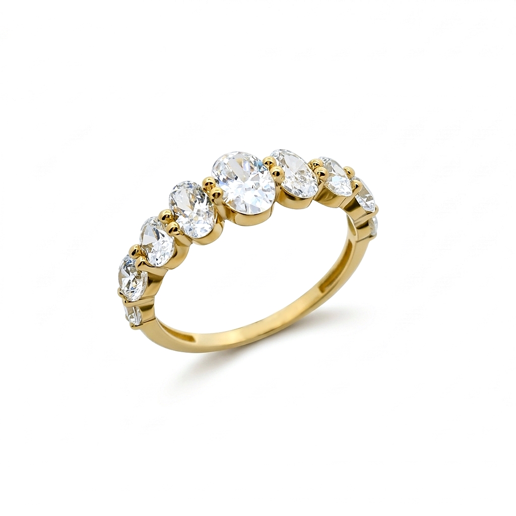 Ένα εντυπωσιακό και μοντέρνο σειρέ δαχτυλίδι, που ξεχωρίζει για τον ιδιαίτερο σχεδιασμό των πετρών του. Αποτελεί μια εξαιρετική επιλογή για μια γυναίκα που αναζητά ένα κόσμημα με όγκο και λάμψη. Κατασκευασμένο από χρυσό 9 καρατίων, με λουστρέ φινίρισμα που αναδεικνύει την ψυχρή, καθαρή απόχρωση του μετάλλου. Στολίζεται από επτά λαμπερά ζιργκόν σε οβάλ στρόγγυλη κοπή, τα οποία είναι τοποθετημένα σε φθίνουσα σειρά μεγέθους από το κέντρο προς τα πλάγια. Η κεντρική οβάλ πέτρα είναι η μεγαλύτερη, δίνοντας στο δαχτυλίδι μια αίσθηση μονόπετρου, ενώ οι υπόλοιπες πέτρες πλαισιώνουν αρμονικά τη γάμπα. Οι πέτρες συγκρατούνται με διακριτικά δόντια, εξασφαλίζοντας σταθερότητα και επιτρέποντας στο φως να διαπερνά τα ζιργκόν για μέγιστη σπινθηροβολία.