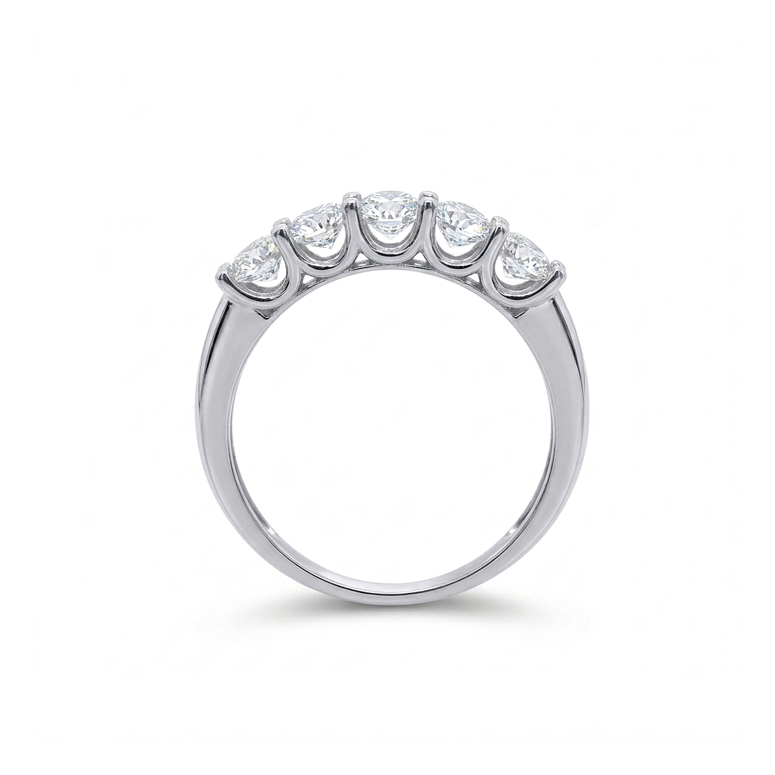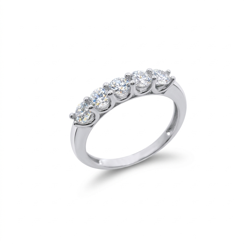 Ένα διαχρονικό και εντυπωσιακό σειρέ δαχτυλίδι, σχεδιασμένο για να προσφέρει λάμψη και κομψότητα σε κάθε περίσταση. Η κλασική του γραμμή το καθιστά ιδανική επιλογή για δώρο επετείου ή για να συνοδεύσει μια βέρα. Κατασκευασμένο από λευκό χρυσό 9 καρατίων, με υψηλής ποιότητας φινίρισμα που αναδεικνύει την ψυχρή και λαμπερή απόχρωση του μετάλλου. Στολίζεται από πέντε λαμπερά ζιργκόν, τοποθετημένα σε σειρά στο πάνω μέρος της γάμπας. Οι πέτρες συγκρατούνται με κοινά δόντια, μια τεχνική που ελαχιστοποιεί το μέταλλο ανάμεσα στις πέτρες, επιτρέποντας στο φως να εισέρχεται ελεύθερα για μέγιστη σπινθηροβολία. Η γάμπα του δαχτυλιδιού είναι στιβαρή αλλά άνετη, με σταδιακή μείωση του πάχους προς το κάτω μέρος για τέλεια εφαρμογή στο δάχτυλο.