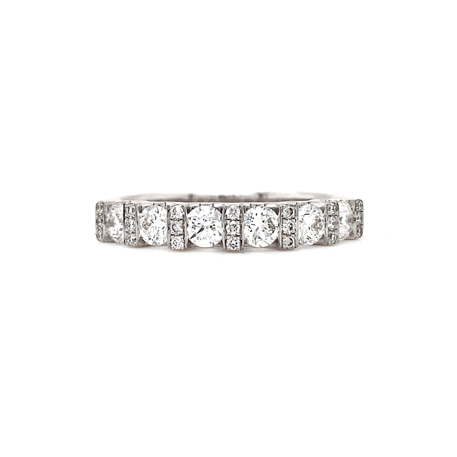 18-carat white gold ring with 6 brilliant-cut diamonds total weight 0,68ct and 21 brilliant-cut diamonds in between total weight 0,11ct, colour F and clarity VS.