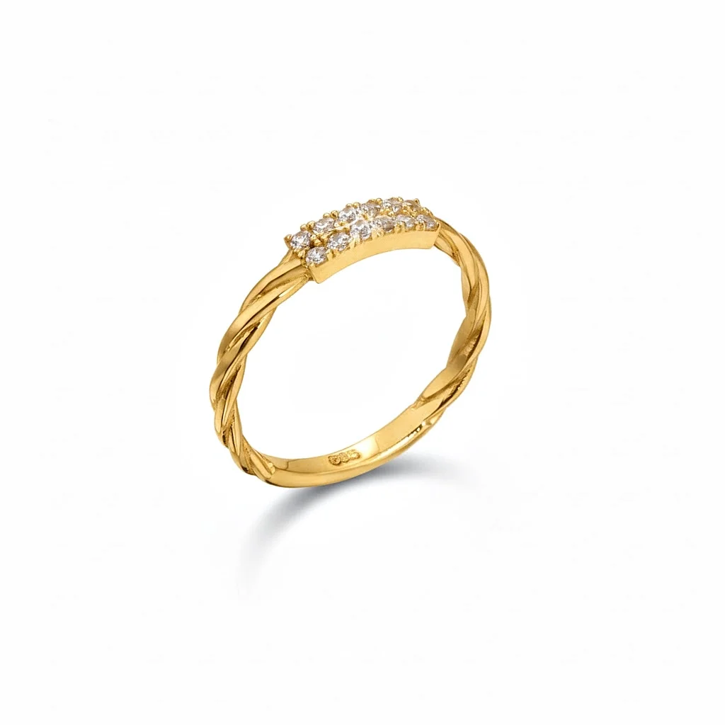 Δακτυλίδι Στριφτή Γάμπα με Διπλή Σειρά Ζιργκόν σε χρυσό 14 καρατίων. Αυτό το δαχτυλίδι είναι ιδανικό για layering με άλλα δαχτυλίδια ή για να φορεθεί μόνο του ως μια διακριτική αλλά πολυτελής λεπτομέρεια.