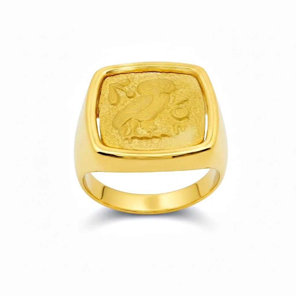 Στη μια όψη, φιλοξενεί μια ανάγλυφη παράσταση που παραπέμπει σε αρχαίο νόμισμα, προσδίδοντας ένα μοναδικό, κλασικό στυλ, ενώ στην άλλη όψη φέρει μια λεπτομερή, ανάγλυφη παράσταση της κουκουβάγιας της Αθηνάς, ένα σύμβολο σοφίας και γνώσης, εμπνευσμένο από αρχαία νομίσματα. Ο κίτρινος χρυσός 14Κ προσφέρει λαμπερό φινίρισμα και ανθεκτικότητα. Είναι το τέλειο δαχτυλίδι για τον σύγχρονο άνδρα ή τη γυναίκα που εκτιμά την ελληνική κληρονομιά και αναζητά ένα statement piece.