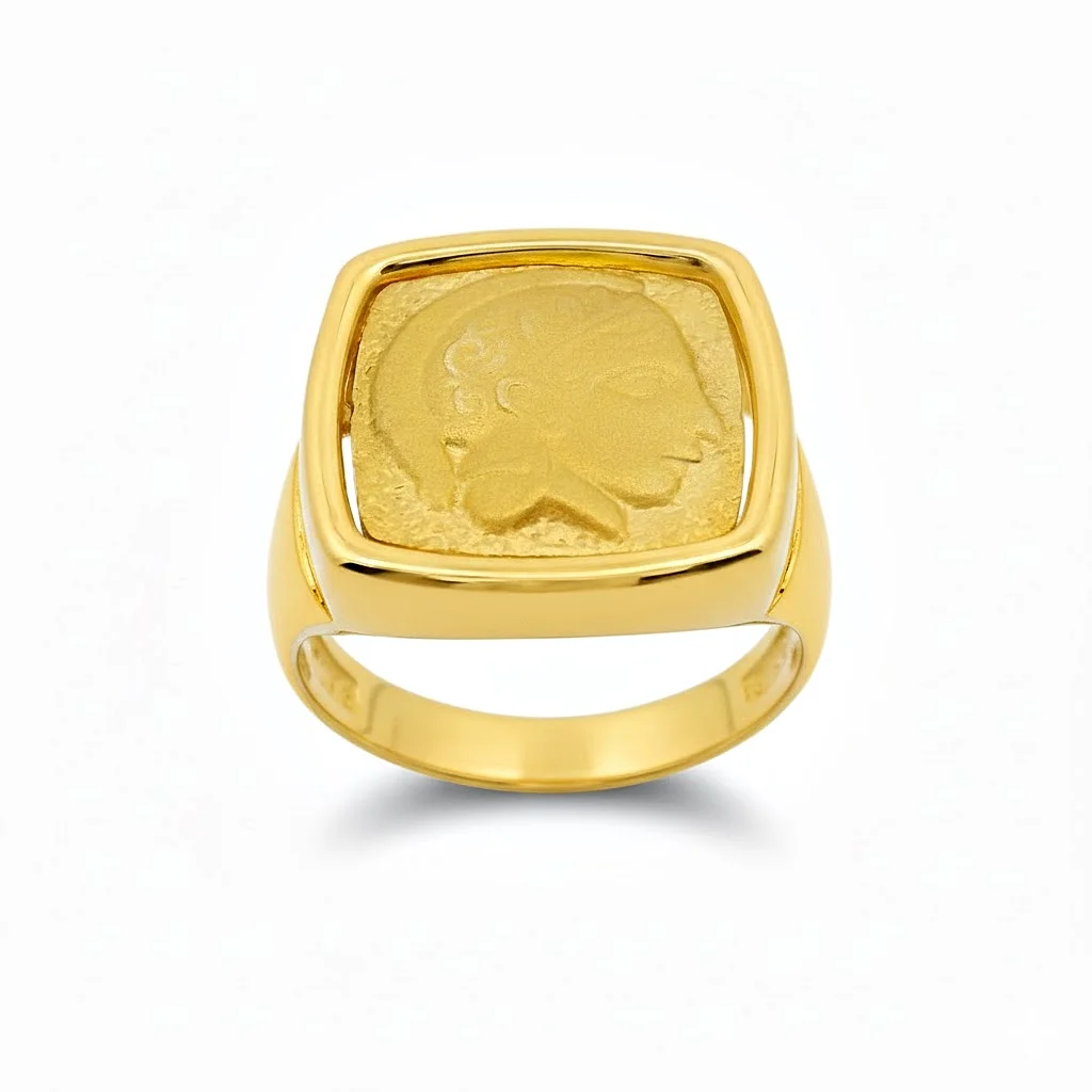 Ένα κόσμημα με διαχρονική αίγλη και ιστορική αναφορά! Αυτό το επιβλητικό χρυσό δαχτυλίδι 14 καρατίων έχει σχεδιαστεί σε μια στιβαρή, τετράγωνη φόρμα (Signet Ring), ιδανική για όσους αγαπούν τα κοσμήματα με χαρακτήρα.
