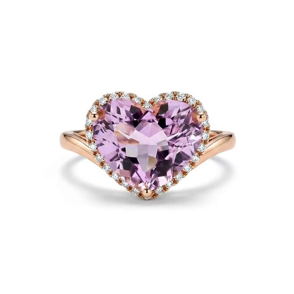Εκφράστε τα συναισθήματά σας με ένα κόσμημα που υμνεί τον ρομαντισμό. Αυτό το εντυπωσιακό δαχτυλίδι σε σχήμα καρδιάς συνδυάζει την τρυφερή απόχρωση του ροζ χρυσού με έναν σπάνιο αμέθυστο, δημιουργώντας ένα αποτέλεσμα που μαγνητίζει το βλέμμα.