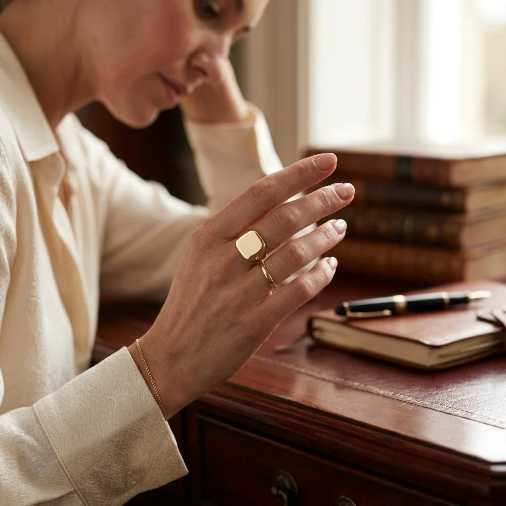 Ανακαλύψτε την κομψότητα της απλότητας με αυτό το minimal χρυσό σεβαλιέ δαχτυλίδι. Σχεδιασμένο για τη σύγχρονη γυναίκα που αγαπά την “ήσυχη πολυτέλεια”, αυτό το κομμάτι αποτελεί μια διαχρονική προσθήκη σε κάθε συλλογή κοσμημάτων. Κατασκευασμένο από χρυσό 9 καρατίων με εξαιρετικά γυαλιστερό φινίρισμα, διαθέτει μια καθαρή, τετραγωνισμένη κεφαλή με ελαφρώς στρογγυλεμένες γωνίες, που προσφέρει μια στιβαρή αλλά θηλυκή γεωμετρία. Η λεία επιφάνειά του επιτρέπει στον χρυσό να αναδείξει τη φυσική του λάμψη. Ιδανικό για να φορεθεί στο μικρό δάχτυλο για ένα κλασικό σεβαλιέ στυλ, ή στον δείκτη/μεσαίο για μια πιο μοντέρνα, geometric εμφάνιση. Είναι το απόλυτο “paspartout” κόσμημα. Η απλότητα του σχεδίου του το καθιστά εξαιρετικά ευέλικτο: μπορεί να φορεθεί μόνο του για ένα minimal look, ή σε συνδυασμό με άλλα δαχτυλίδια (stacking) για ένα πιο Statement αποτέλεσμα. Η λεία επιφάνειά του προσφέρεται, εάν το επιθυμείτε, για χάραξη αρχικών, κάνοντάς το ένα μοναδικό και προσωπικό δώρο.