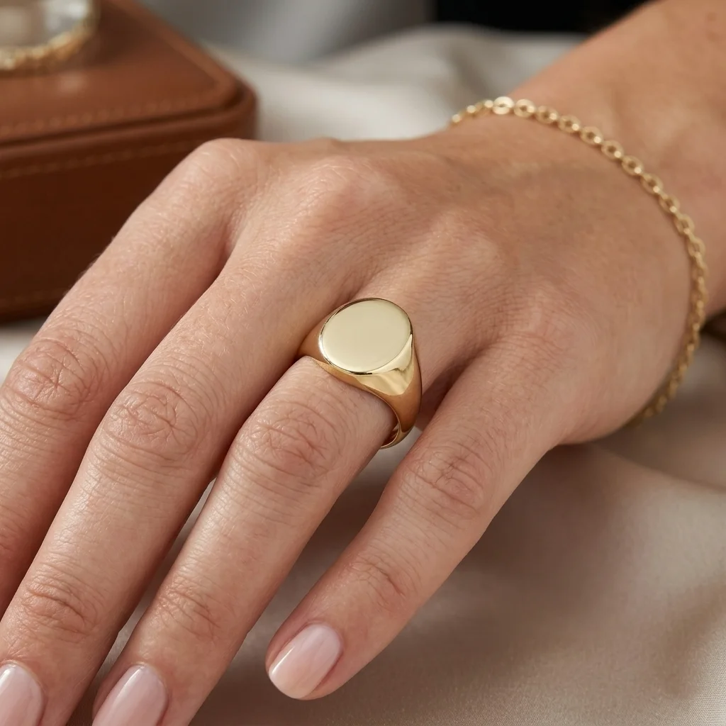 Ένα διαχρονικό κόσμημα που συνδυάζει την κλασική αισθητική των δαχτυλιδιών “Signet” με τη θηλυκότητα. Κατασκευασμένο από χρυσό 9 καρατίων, αυτό το σεβαλιέ είναι σχεδιασμένο για τη γυναίκα που εκτιμά τα minimal αλλά επιβλητικά αξεσουάρ. Κομψή οβάλ κεφαλή με λεία επιφάνεια, που αγκαλιάζει απαλά το δάχτυλο και Λουστρέ φινίρισμα για έντονη λάμψη που αναδεικνύει το χρώμα του χρυσού. Η επιφάνειά του είναι ιδανική για χάραξη μονογράμματος, ημερομηνίας, μετατρέποντάς το σε ένα μοναδικό ενθύμιο. Αν και παραδοσιακά φοριέται στο μικρό δάχτυλο, η λεπτή και φινετσάτη γραμμή του επιτρέπει να φορεθεί με την ίδια επιτυχία στον παράμεσο ή τον δείκτη, μόνο του ή σε συνδυασμό με άλλα λεπτά δαχτυλίδια (stacking style). Μια εξαιρετική πρόταση δώρου για αποφοίτηση, γενέθλια ή για να γιορτάσετε μια προσωπική επιτυχία.