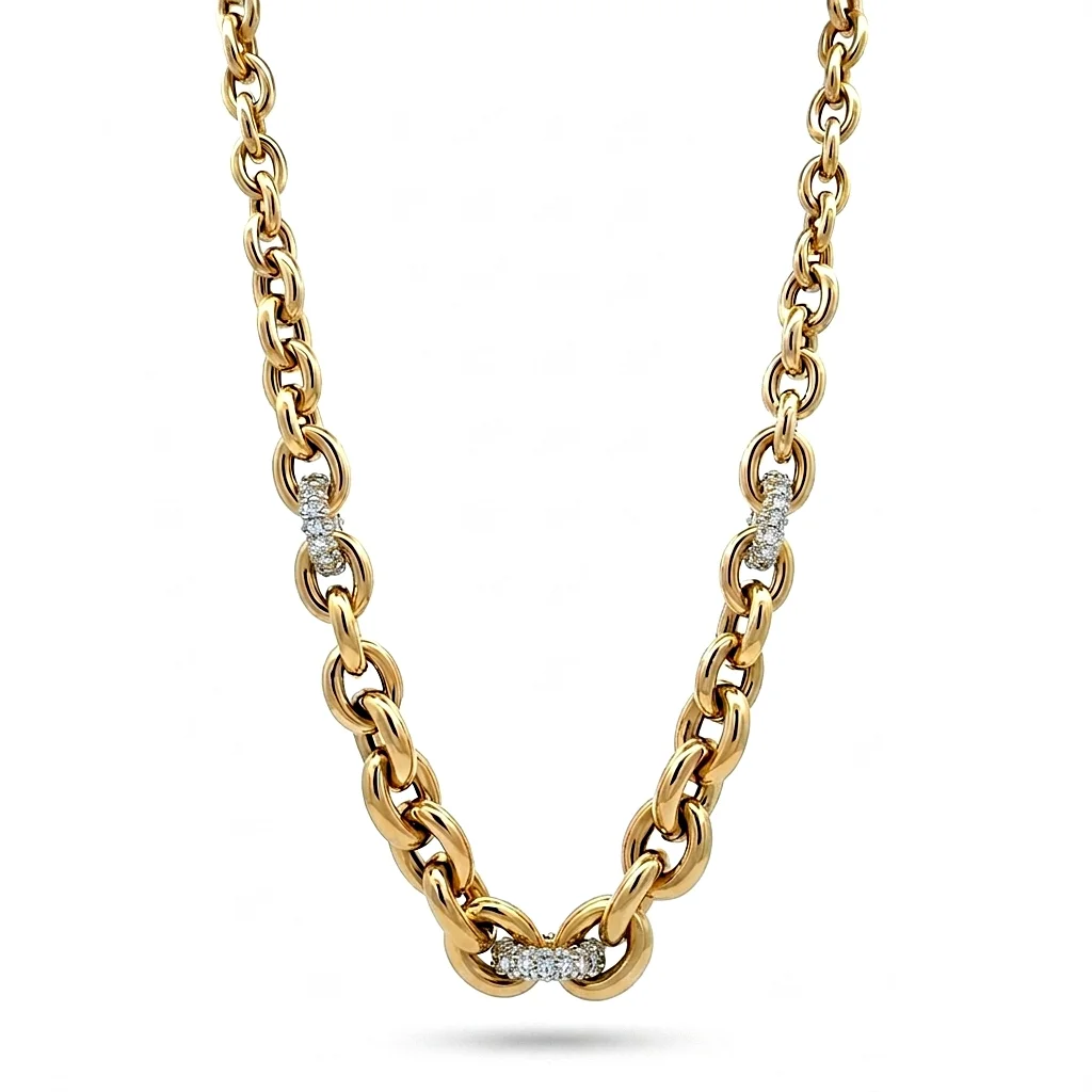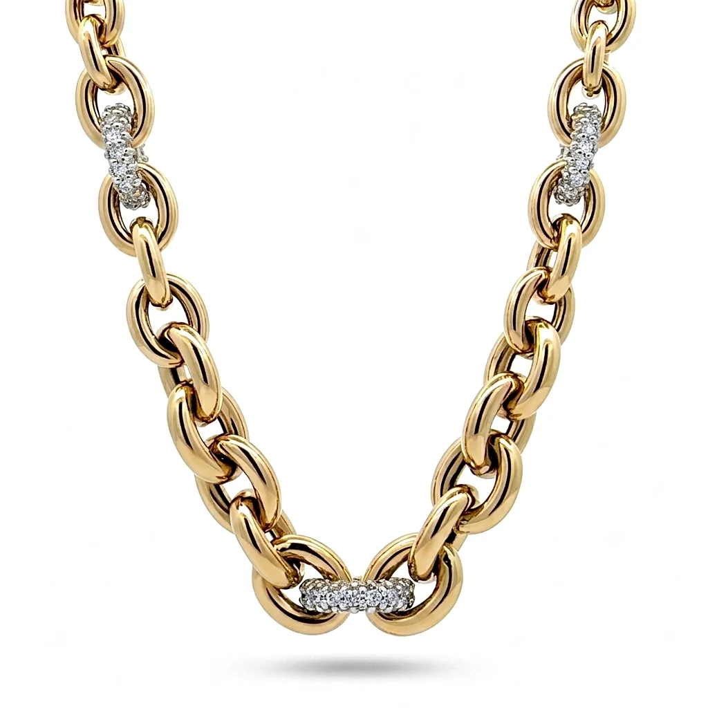 Αναδείξτε κάθε σας εμφάνιση με αυτό το μεγαλειώδες κολιέ 14 καρατίων. Με σχεδιασμό που ισορροπεί ανάμεσα στο κλασικό chic και το μοντέρνο industrial style, αυτό το κολιέ αποτελεί μια επένδυση στην κομψότητα. Οι πληθωρικοί χρυσοί κρίκοι διακόπτονται στρατηγικά από στοιχεία διακοσμημένα με πέτρες ζιεγκόν, προσφέροντας μια ασυναγώνιστη αίσθηση πολυτέλειας. Αυτό το κολιέ δεν είναι απλώς ένα αξεσουάρ, αλλά ένα διαχρονικό κειμήλιο. Η ποιότητα κατασκευής εξασφαλίζει ότι θα παραμείνει αναλλοίωτο στο χρόνο, ενώ η εντυπωσιακή του παρουσία το καθιστά την ιδανική επιλογή για τις πιο σημαντικές σας στιγμές.