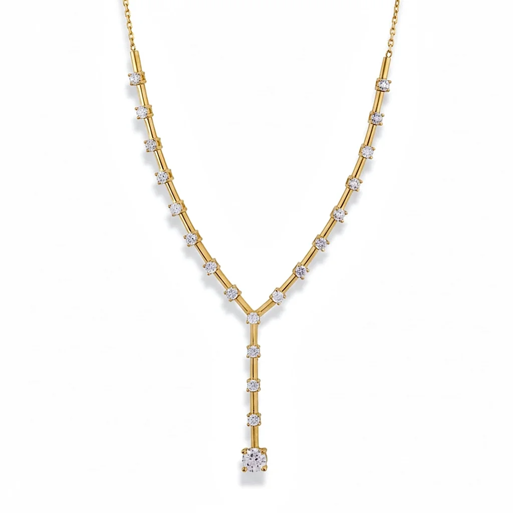 An εντυπωσιακό and μοντέρνο κολιέ που αγκαλιάζει μοναδικά το ντεκολτέ, προσφέροντας μια αίσθηση επιμήκυνσης και απαράμιλλης λάμψης. Είναι κατασκευασμένο από κίτρινο χρυσό 14 καρατίων και ξεχωρίζει για τον γεωμετρικό του σχεδιασμό. Διαθέτει το ιδιαίτερα δημοφιλές σχήμα “Y”, το οποίο καταλήγει σε μια κομψή κάθετη σειρά. Η μπροστινή πλευρά αποτελείται από χρυσές μπάρες, πάνω στις οποίες είναι τοποθετημένα δεκαεπτά λαμπερά ζιργκόν σε τακτά διαστήματα. Στο τελείωμα της κάθετης σειράς δεσπόζει ένα μεγαλύτερο ζιργκόν, το οποίο λειτουργεί ως το κεντρικό στοιχείο λάμψης του κοσμήματος. Μια λεπτή και διακριτική αλυσίδα ολοκληρώνει το κολιέ, επιτρέποντας στο κεντρικό σχέδιο να πρωταγωνιστεί. Αυτό το κολιέ είναι η ιδανική επιλογή για βραδινές εμφανίσεις ή για να αναβαθμίσετε ένα απλό look με μια δόση σύγχρονης πολυτέλειας.