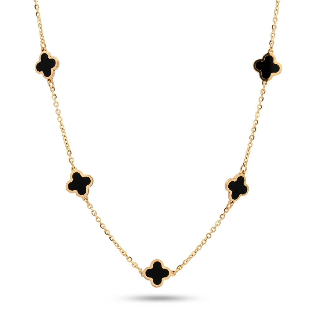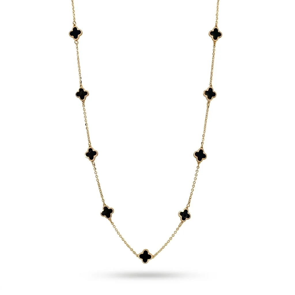 Ανακαλύψτε την απόλυτη έκφραση της θηλυκότητας με αυτό το εντυπωσιακό κολιέ 14 καρατίων. Διακοσμημένο με εννέα εμβληματικά μοτίβα τριφυλλιού σε μαύρο χρώμα, το συγκεκριμένο κόσμημα αγκαλιάζει ομοιόμορφα τον λαιμό, προσφέροντας μια συνεχή λάμψη και ένα high-end αισθητικό αποτέλεσμα. Το “Clover Station” κολιέ είναι η ιδανική επιλογή για όσες επιθυμούν ένα κόσμημα που να φαίνεται πλούσιο αλλά να παραμένει ανάλαφρο και άνετο. Η διάταξη των στοιχείων εξασφαλίζει ότι το κολιέ θα δείχνει εντυπωσιακό από κάθε γωνία. Είναι το τέλειο statement κομμάτι για να αναβαθμίσετε ένα office look ή για να προσθέσετε λάμψη σε μια βραδινή έξοδο.