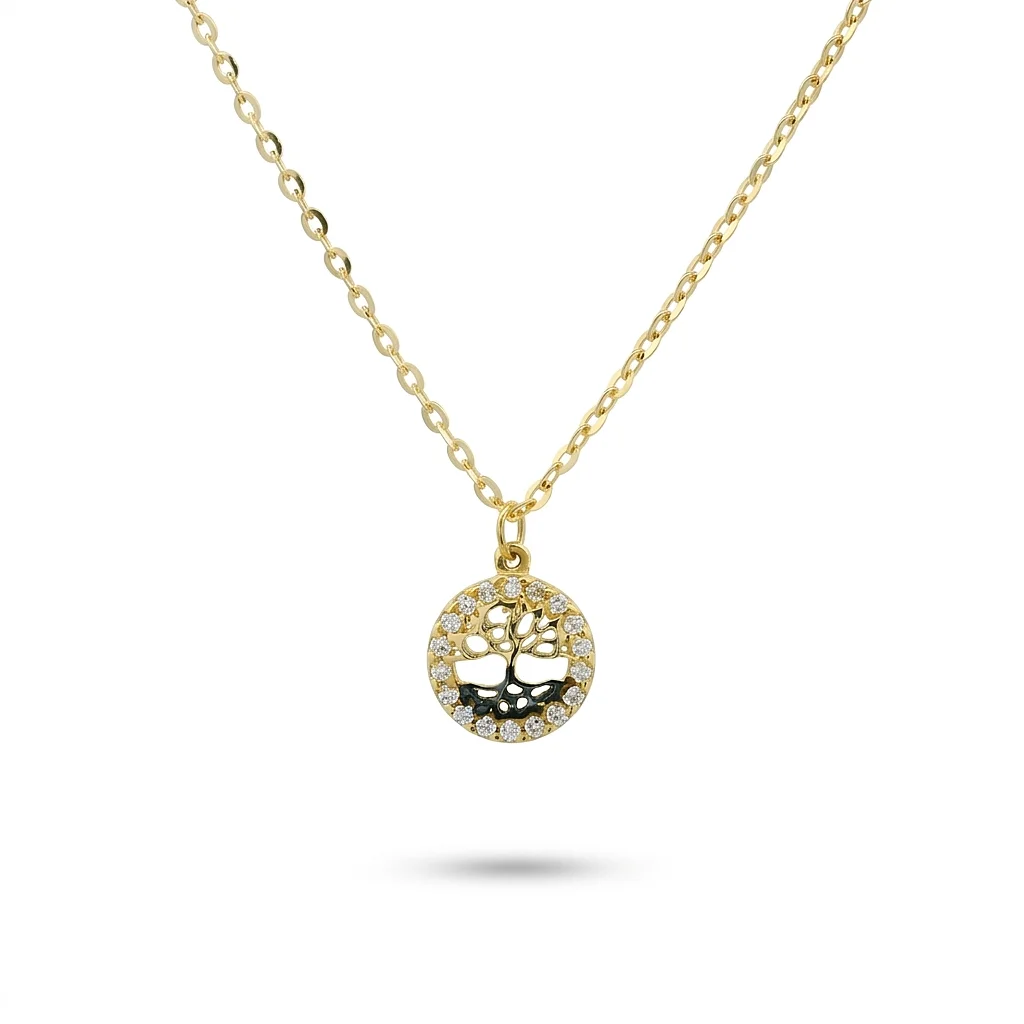 Κολιέ με το δέντρο της ζωής σε χρυσό 9 καράτια με πέτρες ζιργκόν. Μήκος αλυσίδας 42cm με ενδιάμεσο κρίκο στους 40cm.