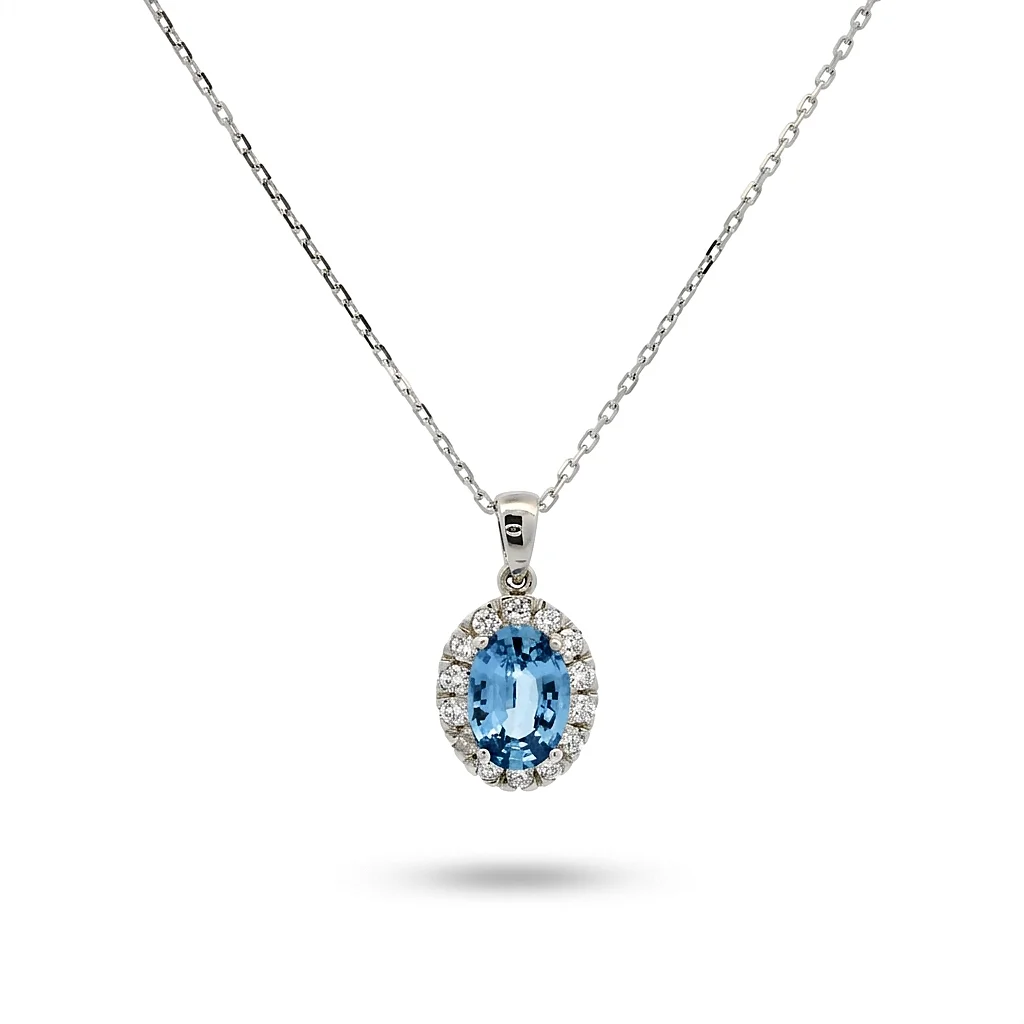Κολιέ σε λευκόχρυσο 18 καρατίων με Ζαφείρι 0,73ct στο κέντρο και διαμάντια σε κοπή μπριγιάν 0.14ct.