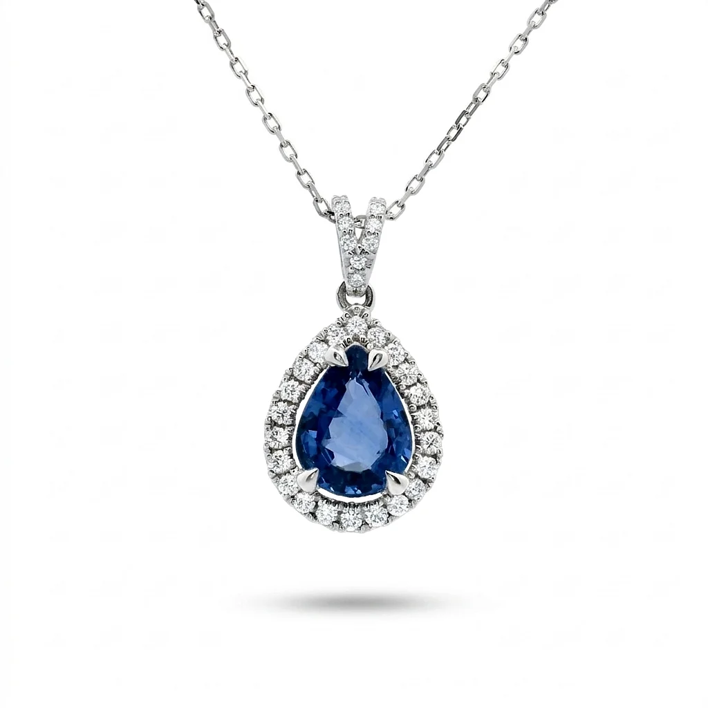 Το Pear σχήμα του ζαφειριού συμβολίζει τη χαρά και τη θηλυκότητα. Το βαθύ μπλε χρώμα του ζαφειριού σε συνδυασμό με τη λευκότητα των διαμαντιών και του λευκόχρυσου, καθιστούν αυτό το μενταγιόν μια ιδανική επιλογή για δώρο γενεθλίων, επετείου ή για να συνοδεύσει μια νύφη την ημέρα του γάμου της (“something blue”).