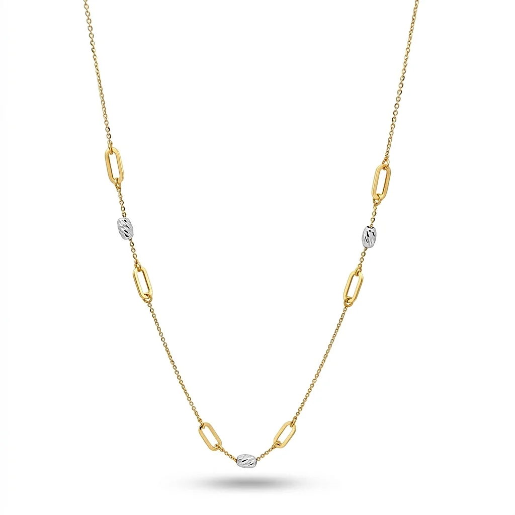 Ένα κομψό και μοντέρνο κολιέ κατασκευασμένο από 14-carat gold, που συνδυάζει την κλασική λάμψη του κίτρινου χρυσού με τις ψυχρές ανταύγειες του λευκόχρυσου. Το σχέδιο χαρακτηρίζεται από μια λεπτή αλυσίδα που διακόπτεται συμμετρικά από επιμήκεις οβάλ κρίκους, προσφέροντας μια ανάλαφρη και σύγχρονη αισθητική. Ανάμεσα στους κρίκους είναι τοποθετημένες λευκόχρυσες μπίλιες με diamond-cut φινίρισμα, οι οποίες αντανακλούν το φως από κάθε γωνία, προσδίδοντας επιπλέον λάμψη στο κόσμημα. Η γεωμετρική του γραμμή το καθιστά ιδανική επιλογή για δώρο, καθώς ταιριάζει με κάθε στυλ ντυσίματος, από casual μέχρι επίσημο.