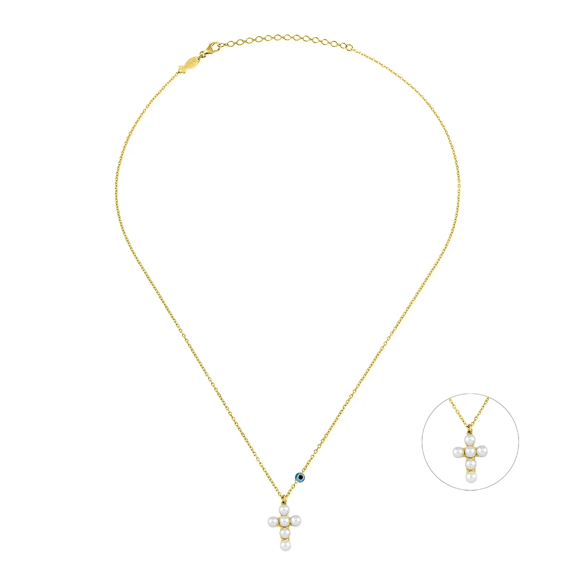 Κολιέ Σταυρός με Μαργαριτάρια και Μάτι Kurshuni από επιχρυσωμένο ασήμι 925. Μήκος αλυσίδας 39cm και 3cm προέκταση.
