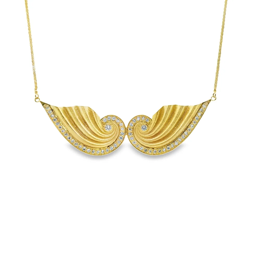 This stunning gold pendant is a perfect blend of elegance and artistry. Crafted with intricate detailing, it features a unique wave design that beautifully captures the light. Embellished with sparkling diamonds, this piece is perfect for both casual and formal occasions, making it a versatile addition to any jewellery collection.