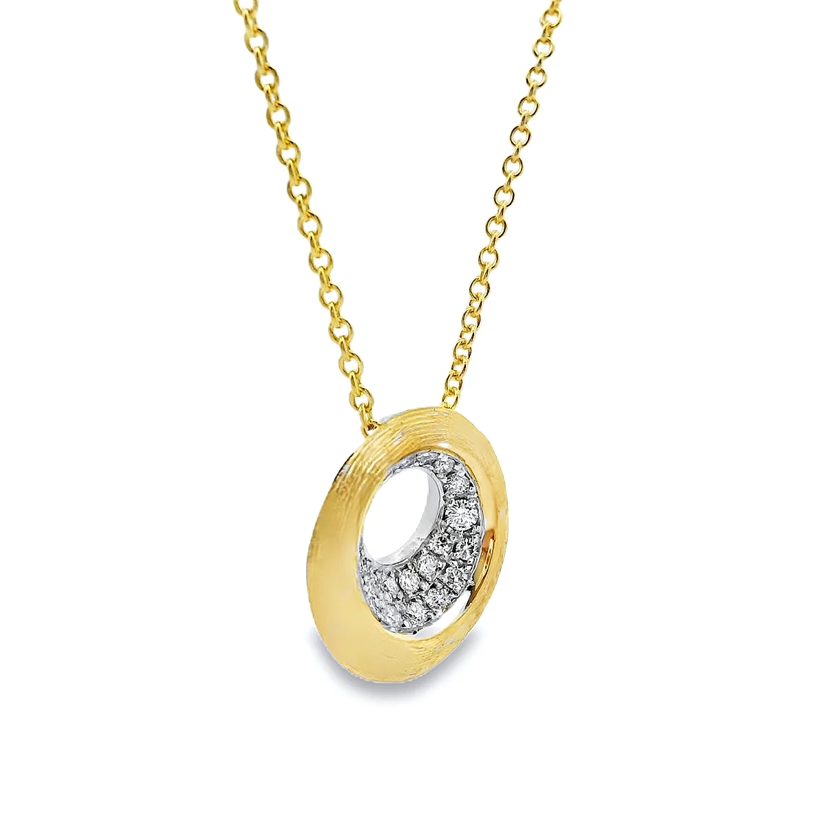 This stunning gold pendant features a unique circular design, gracefully showcasing a sparkling diamond centre. Perfect for adding a touch of elegance to any outfit, this piece is perfect for both casual and formal occasions. Wear it on its own or pair it with other necklaces for a modern look.