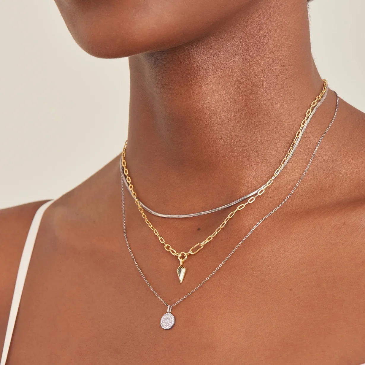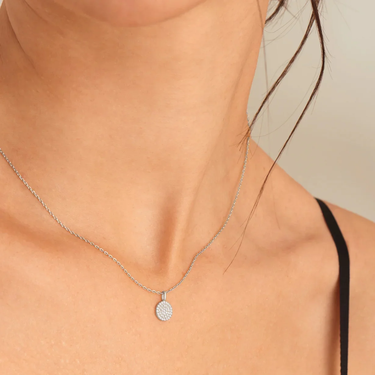 Αυτή τη σεζόν ανεβάζουμε τη λάμψη σε ένα νέο επίπεδο με το κολιέ μας με ζιργκόν, το οποίο διαθέτει ένα κρεμαστό στοιχείο σε σχήμα δίσκου, στολισμένο με λαμπερές πέτρες. Το εντυπωσιακό στρογγυλό κρεμαστό στοιχείο, που κρέμεται από μια κλασική, λεπτή αλυσίδα, περιβάλλεται από σειρές λαμπερών πετρών. Αποτελεί ένα εντυπωσιακό κομμάτι από μόνο του, αλλά είναι επίσης ιδανικό για να το συνδυάσετε με τις αγαπημένες σας λεπτές ασημένιες αλυσίδες.