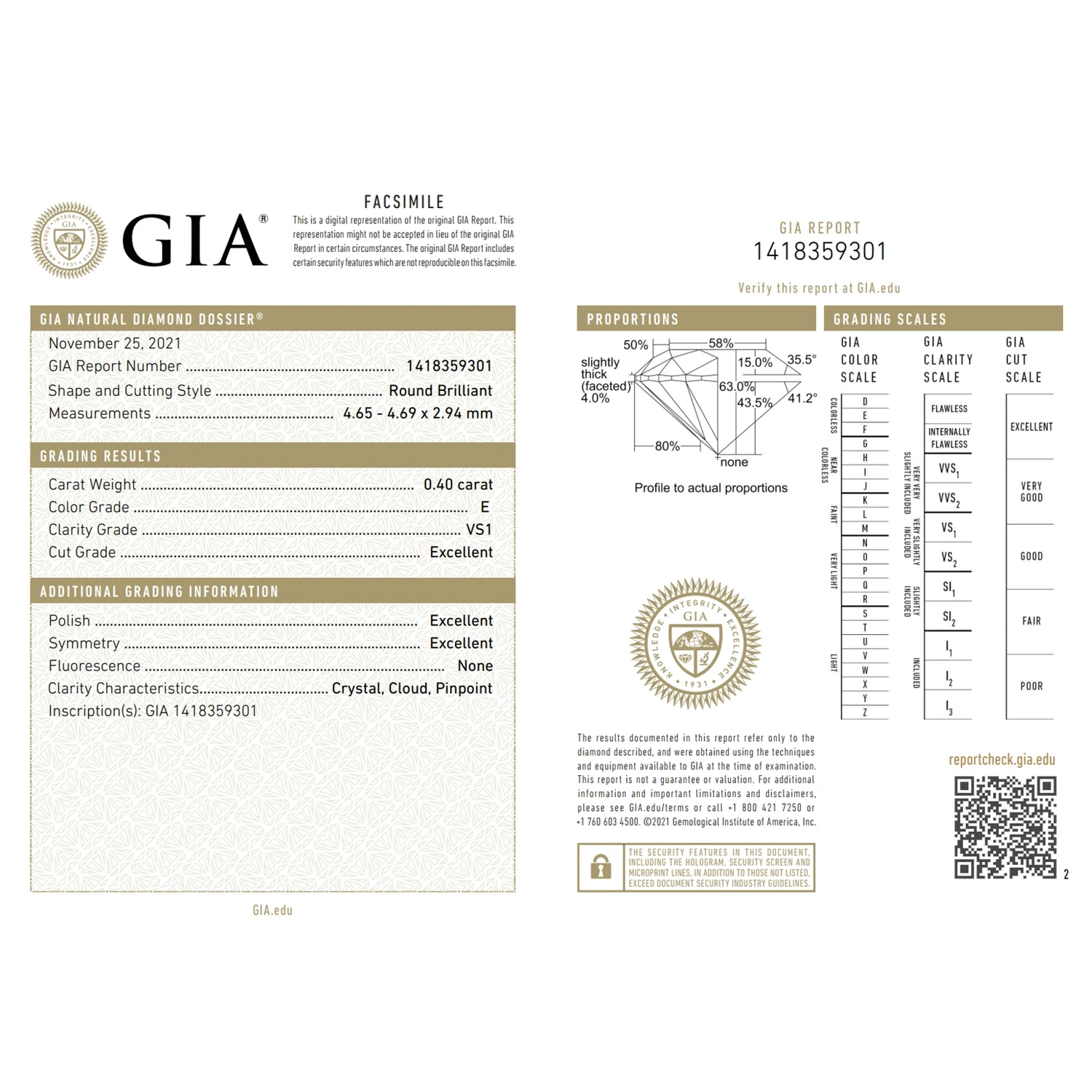 Μονόπετρο δακτυλίδι σε λευκόχρυσο 18 καρατίων με διαμάντι 0,40ct, χρώματος E και καθαρότητας VS2, με excellent κοπή, γυάλισμα και συμμετρία πιστοποιημένο από το GIA και 14 λευκά διαμάντια σε κοπή μπριγιάν συνολικού βάρους 0,16ct.