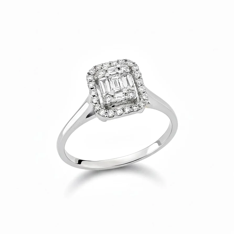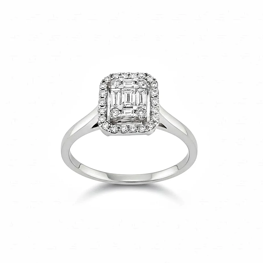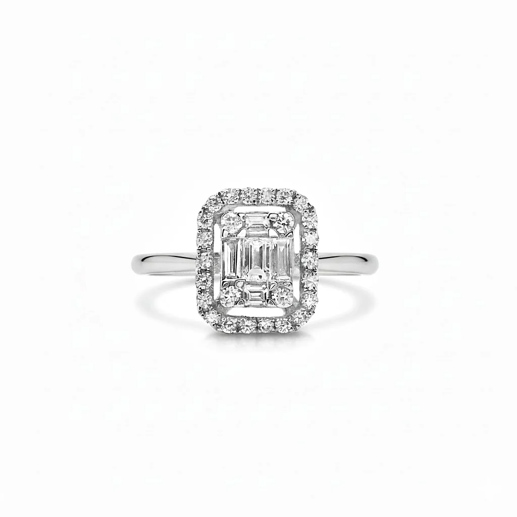 Αυτό το δαχτυλίδι αποτελεί μια εντυπωσιακή δήλωση κομψότητας με επιρροές από την περίοδο Art Deco. Κατασκευασμένο από λευκόχρυσο 18 καρατίων, διαθέτει μια κεντρική σύνθεση από διαμάντια κοπής Baguette και στρογγυλά διαμάντια, δημιουργώντας την αίσθηση ενός μεγάλου, ορθογώνιου διαμαντιού. Η κεντρική διάταξη πλαισιώνεται από ένα λαμπερό Halo από στρογγυλά διαμάντια. Η κοπή Baguette είναι λιγότερο συνηθισμένη και προσδίδει έναν αέρα vintage πολυτέλειας. Ο λευκός χρυσός 18K εξασφαλίζει αντοχή και ένα κομψό, λείο φινίρισμα. Ένα εντυπωσιακό δαχτυλίδι για αρραβώνα ή επέτειο, που ξεχωρίζει.