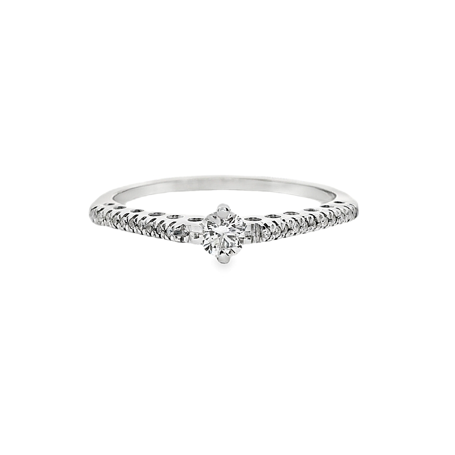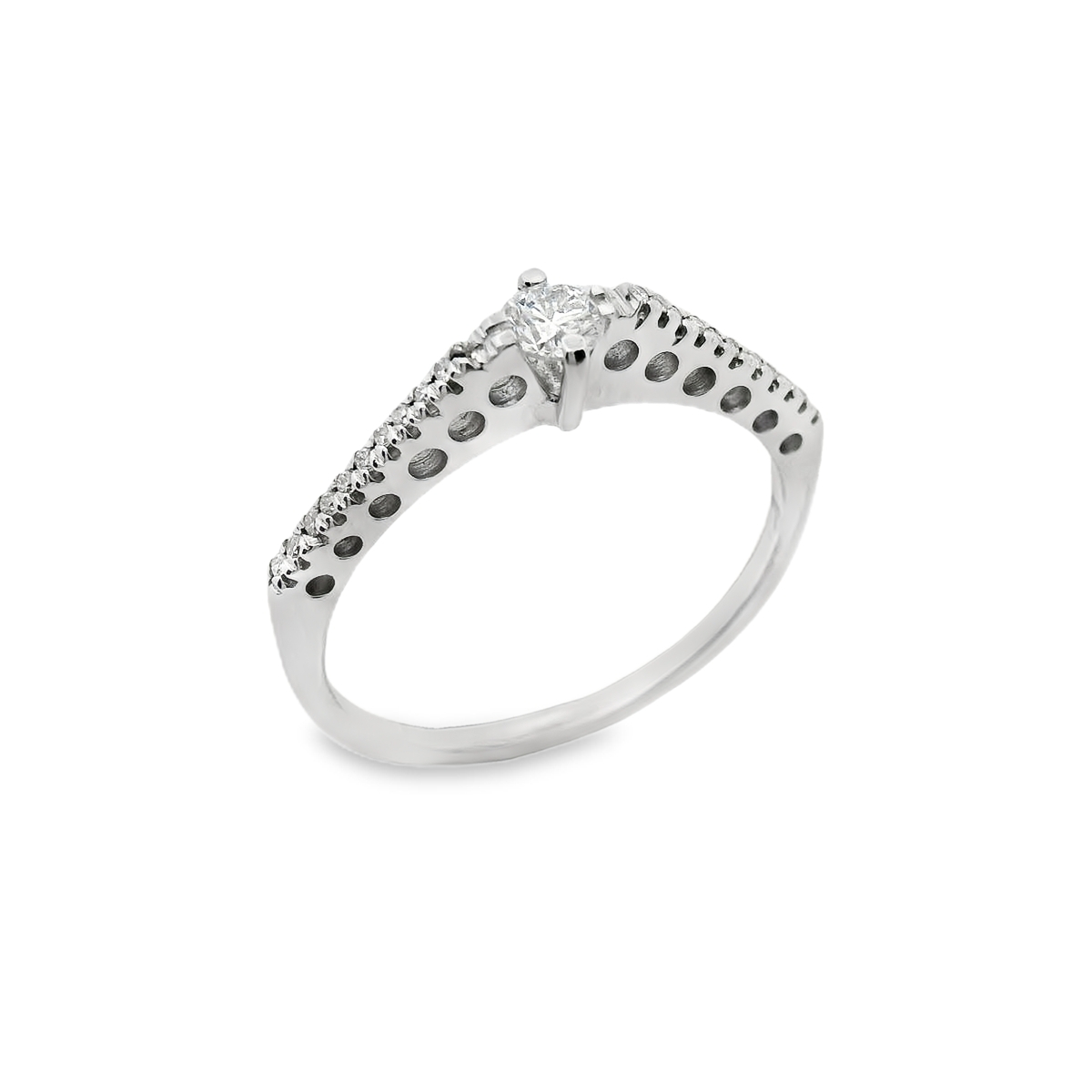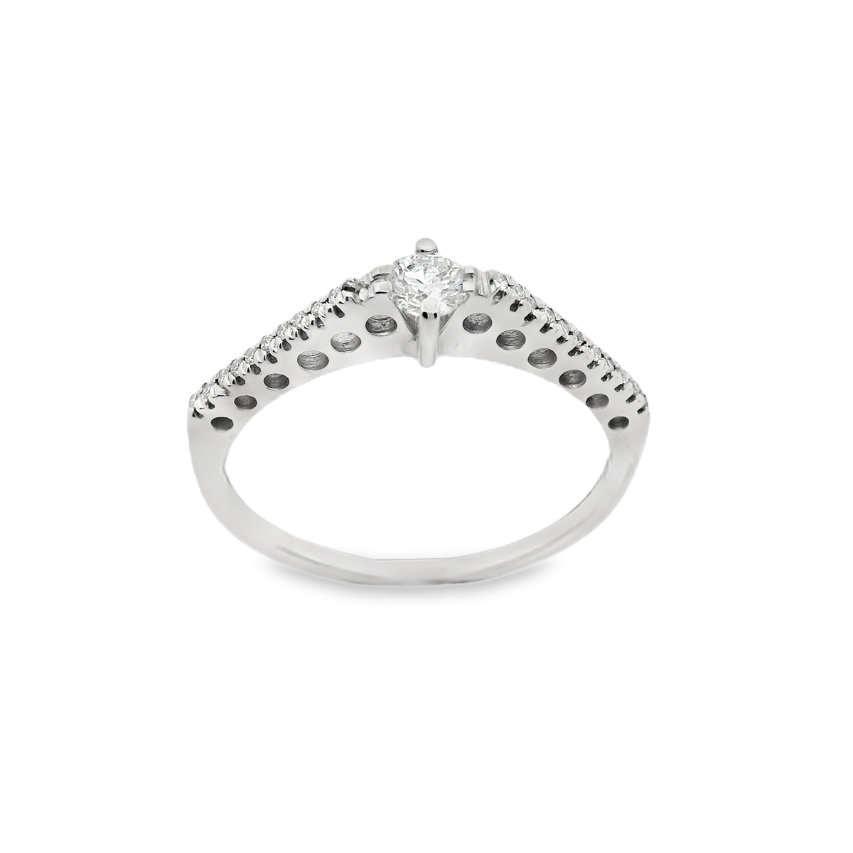 Single stone ring in 18 carat gold with a central diamond weighing 0.14ct in G colour and VS clarity and side diamonds weighing 0.06ct.