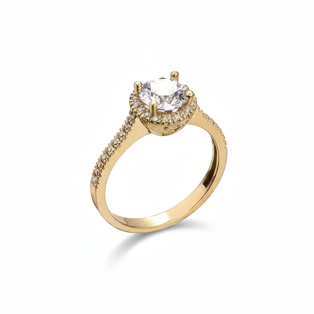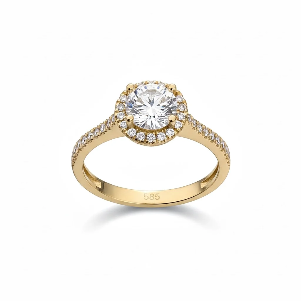 Ένα κόσμημα που αποπνέει πολυτέλεια and κλασική γοητεία, σχεδιασμένο για να προσφέρει τη μέγιστη δυνατή λάμψη στο χέρι σας. Κατασκευασμένο από κίτρινο χρυσό 14 καρατίων, αυτό το δαχτυλίδι τύπου “Halo” συνδυάζει την παραδοσιακή ζεστασιά του χρυσού με έναν άκρως εντυπωσιακό και λαμπερό σχεδιασμό. Στο κέντρο δεσπόζει ένα λαμπερό λευκό ζιργκόν, το οποίο περιβάλλεται από ένα στεφάνι μικρότερων πετρών. Αυτός ο σχεδιασμός ενισχύει οπτικά το μέγεθος της κεντρικής πέτρας και πολλαπλασιάζει τις αντανακλάσεις του φωτός. Η γάμπα του δαχτυλιδιού είναι στολισμένη με σειρά από μικρά ζιργκόν, προσφέροντας μια συνεχή γραμμή λάμψης που αγκαλιάζει το δάχτυλο. Η κεντρική σύνθεση συγκρατείται από τέσσερις στιβαρούς κλάδους, ενώ το προφίλ του δαχτυλιδιού διαθέτει διακριτικά ανοίγματα που επιτρέπουν στο φως να εισχωρεί και να αναδεικνύει την καθαρότητα των πετρών. Ο χρυσός 14K εξασφαλίζει την ιδανική ανθεκτικότητα για καθημερινή χρήση, διατηρώντας αναλλοίωτη την πολύτιμη εμφάνισή του στον χρόνο. Το σχέδιο Halo είναι ιδανικό για όσες αναζητούν ένα δαχτυλίδι που φαίνεται μεγαλύτερο και πιο ακριβό, χάρη στον πλούσιο στολισμό του. Συνδυάζει την κλασική αξία του κίτρινου χρυσού με τη λάμψη που απαιτεί μια σύγχρονη, εντυπωσιακή εμφάνιση. Μια εξαιρετική επιλογή για επέτειο ή για μια πρόταση γάμου που θα κλέψει την παράσταση.