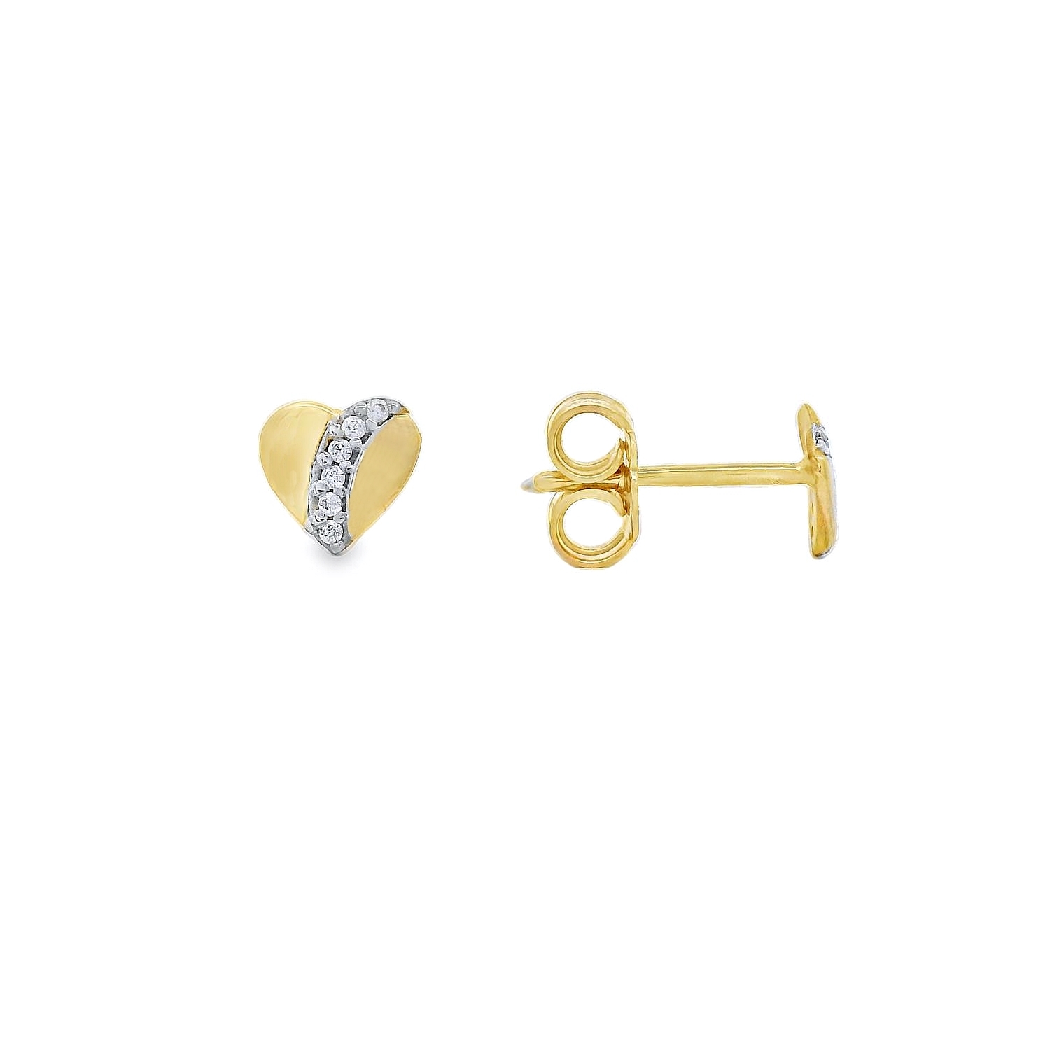Heart earrings in 14 carat gold with white cubic zirconia. Butterfly clasp.