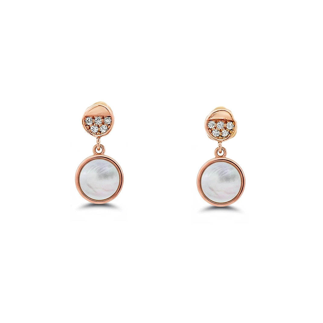 Το πάνω μέρος, τοποθετημένο στο λοβό του αυτιού, διαθέτει μια σειρά από απαλά, λευκά ζιργκόν σε κυκλικό μοτίβο, προσθέτοντας μια έντονη λάμψη. Κάτω από αυτό κρέμεται ένα στρογγυλό μενταγιόν από Mother of Pearl, το οποίο αντανακλά ιριδίζουσες αποχρώσεις. Ο ζεστός τόνος του ροζ χρυσού αναδεικνύει τόσο τη λάμψη των πετρών όσο και τη γαλήνια ομορφιά του μαργαριταριού. Είναι ιδανικά για μια βραδινή έξοδο ή για να δώσετε φινέτσα στην καθημερινή σας εμφάνιση.