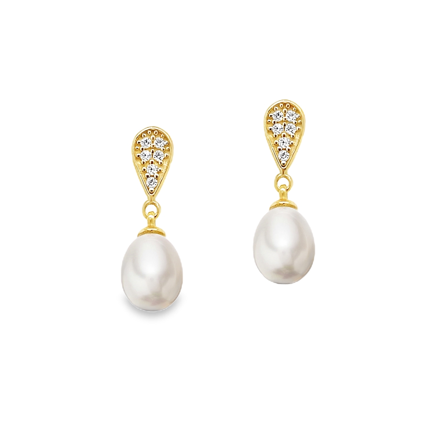 Pearl earrings in 14 carat gold with cubic zirconia.