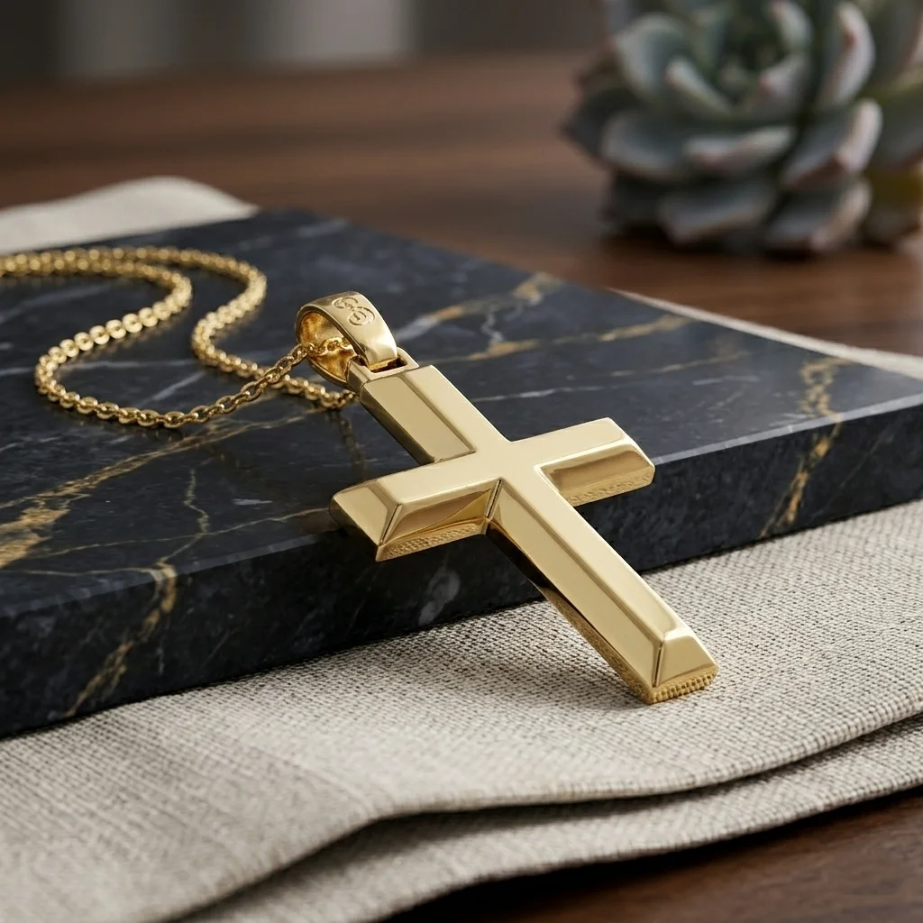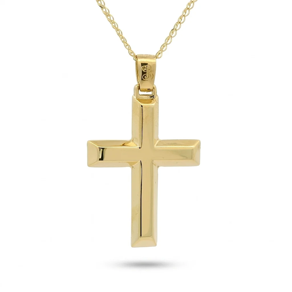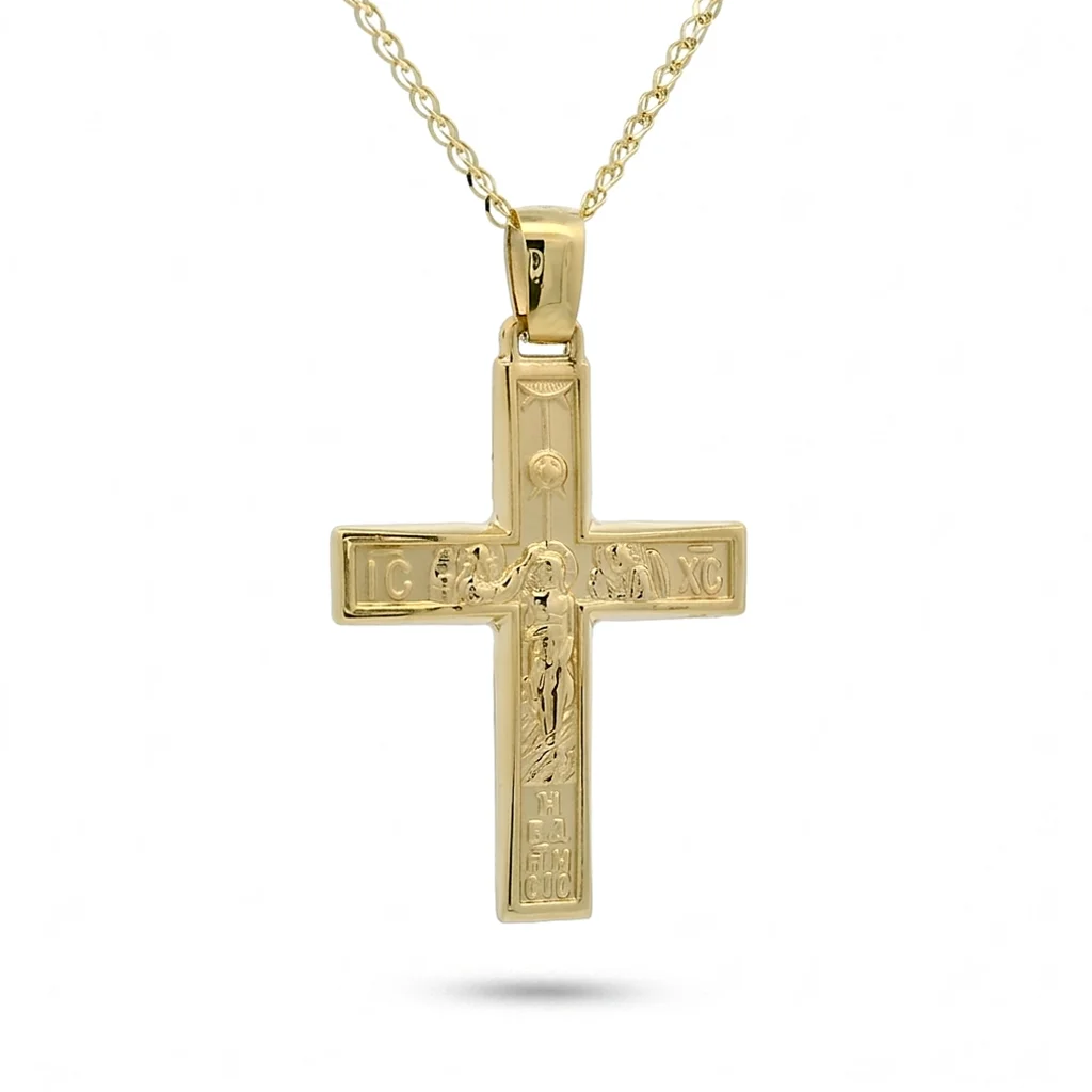 Σταυρός ανδρικός σε κίτρινο χρυσό 14 καράτια διπλής όψης. The chain is sold separately.