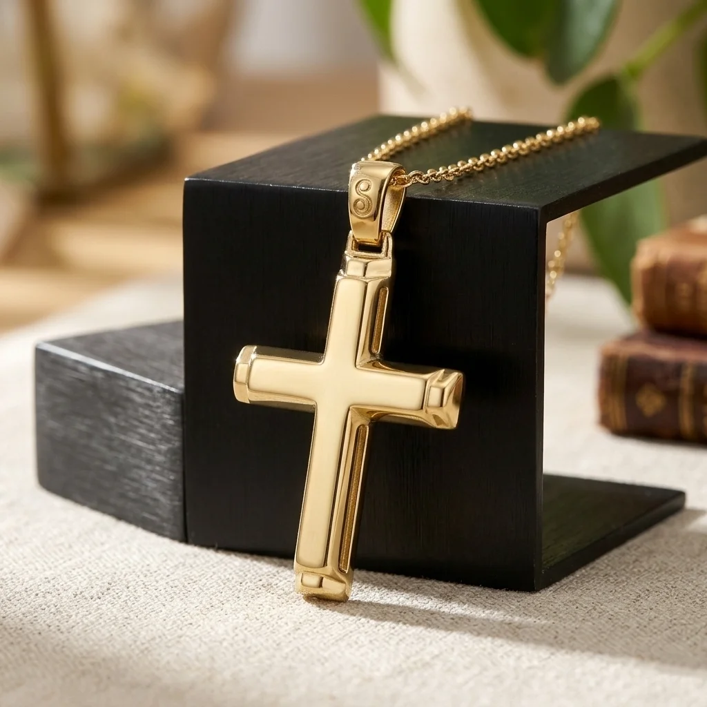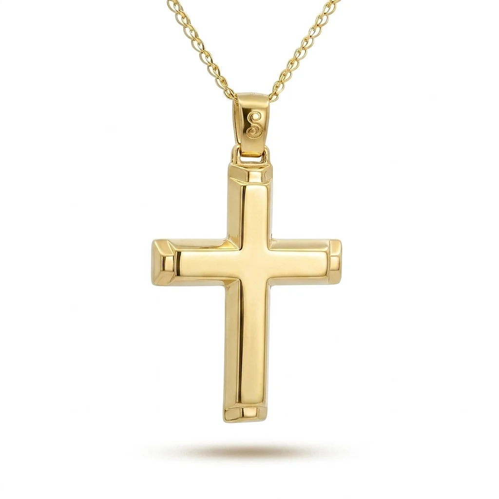 Σταυρός ανδρικός σε κίτρινο χρυσό 14 καράτια διπλής όψης. The chain is sold separately.